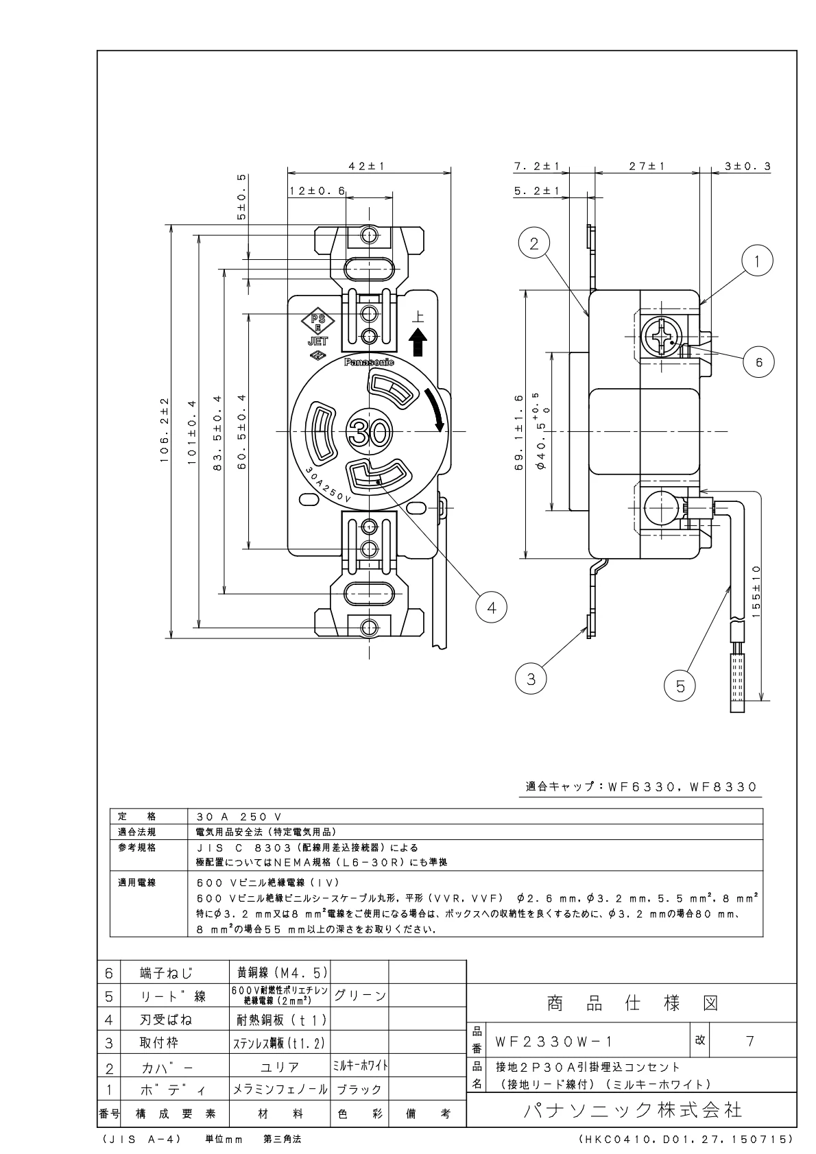 WF2330W1 接地2P30A引掛埋込コンセント(接地リード線付)(ミルキーホワイト)