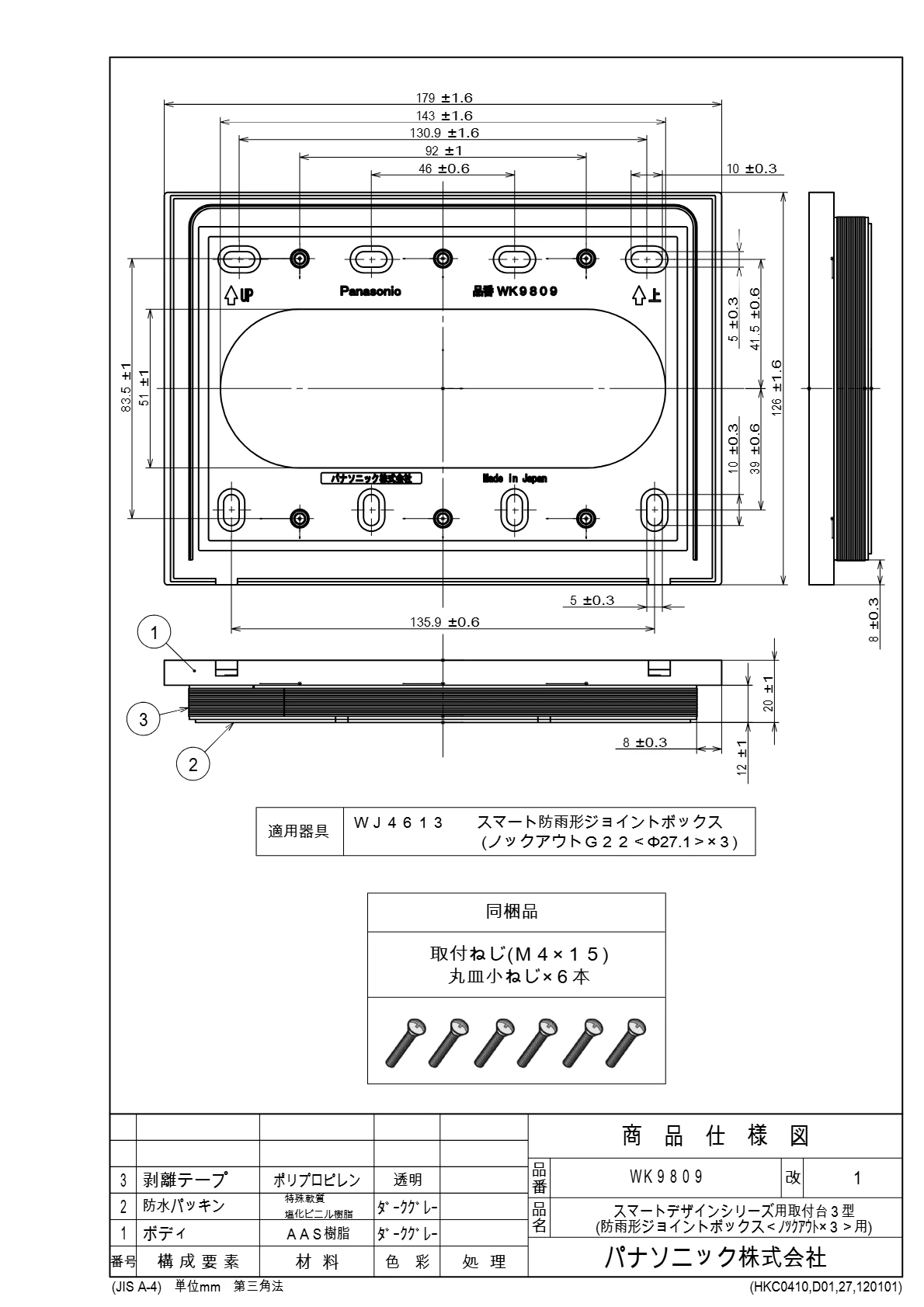 品番:WK9809品名:スマートデザインシリーズ用取付台3型(防雨ジョイントボックス<ノックアウト×3>用)