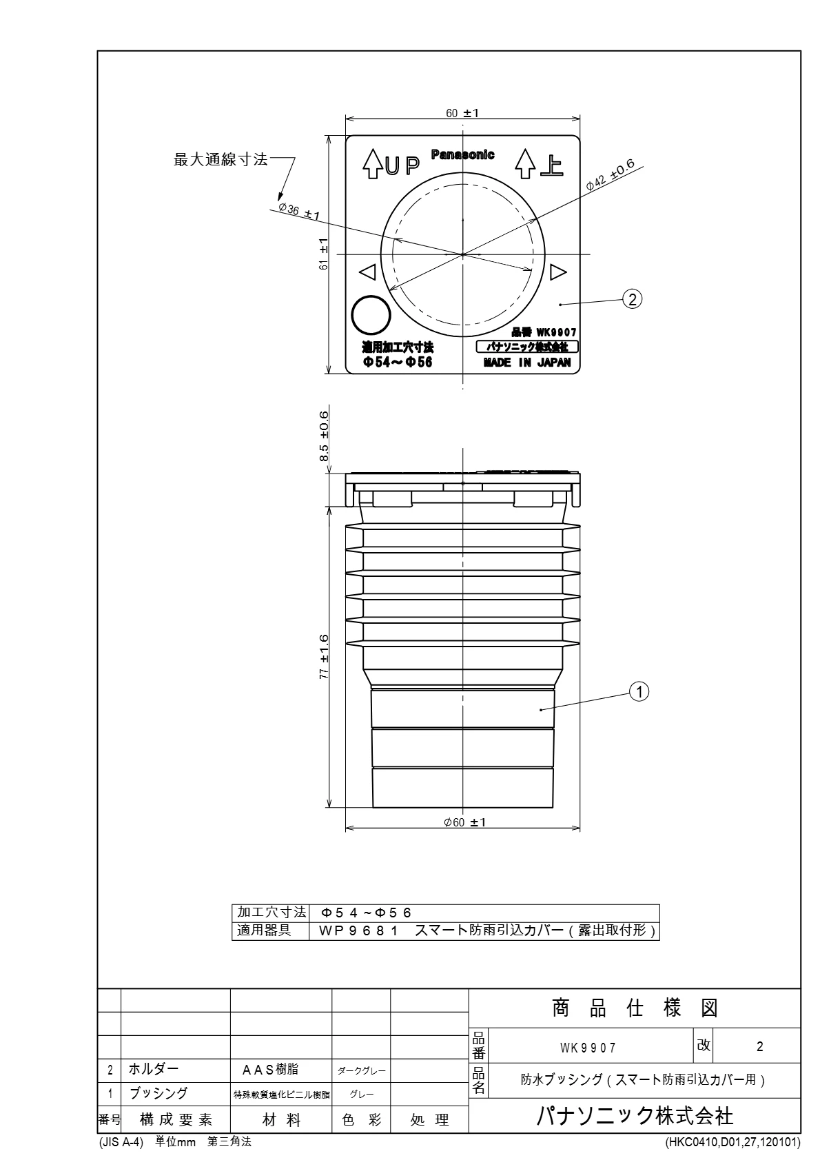 品番:WK9907品名:防水ブッシング(スマート防雨引込カバー用)