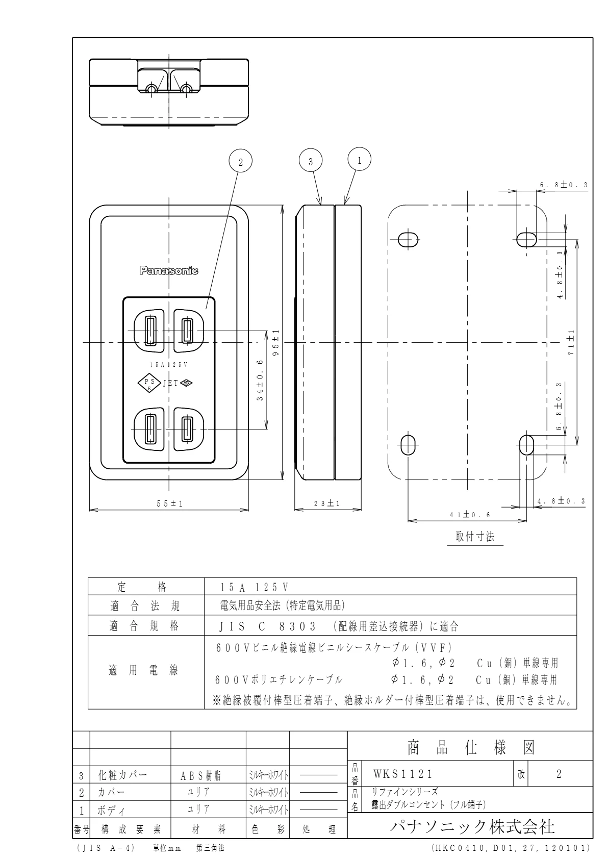 品番:WKS1121品名:リファインシリーズ露出ダブルコンセント(フル端子)