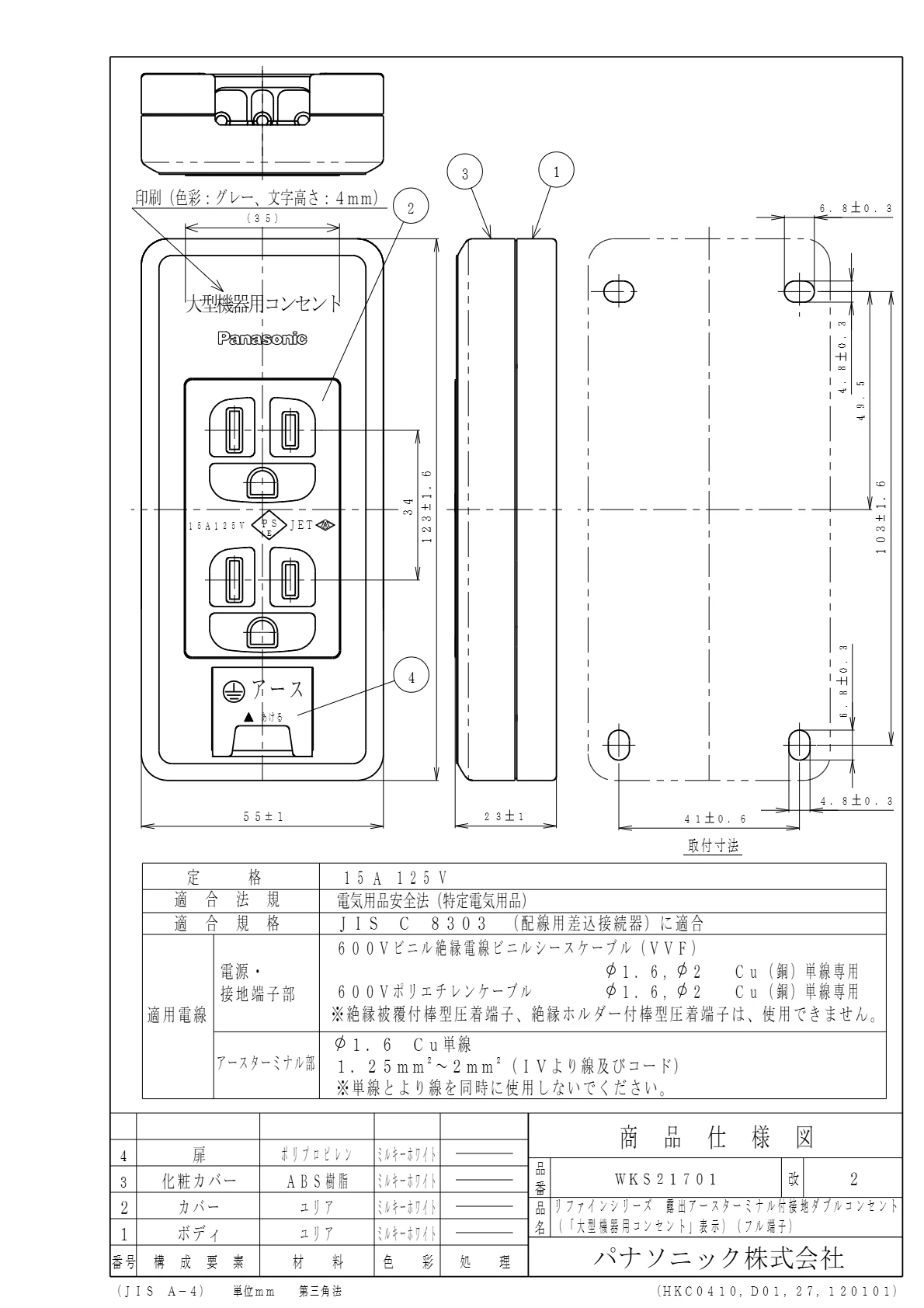 品番:WKS21701品名:リファインシリーズ露出アースターミナル付接地ダブルコンセント(「大型機器用コンセント」表示)(フル端子)