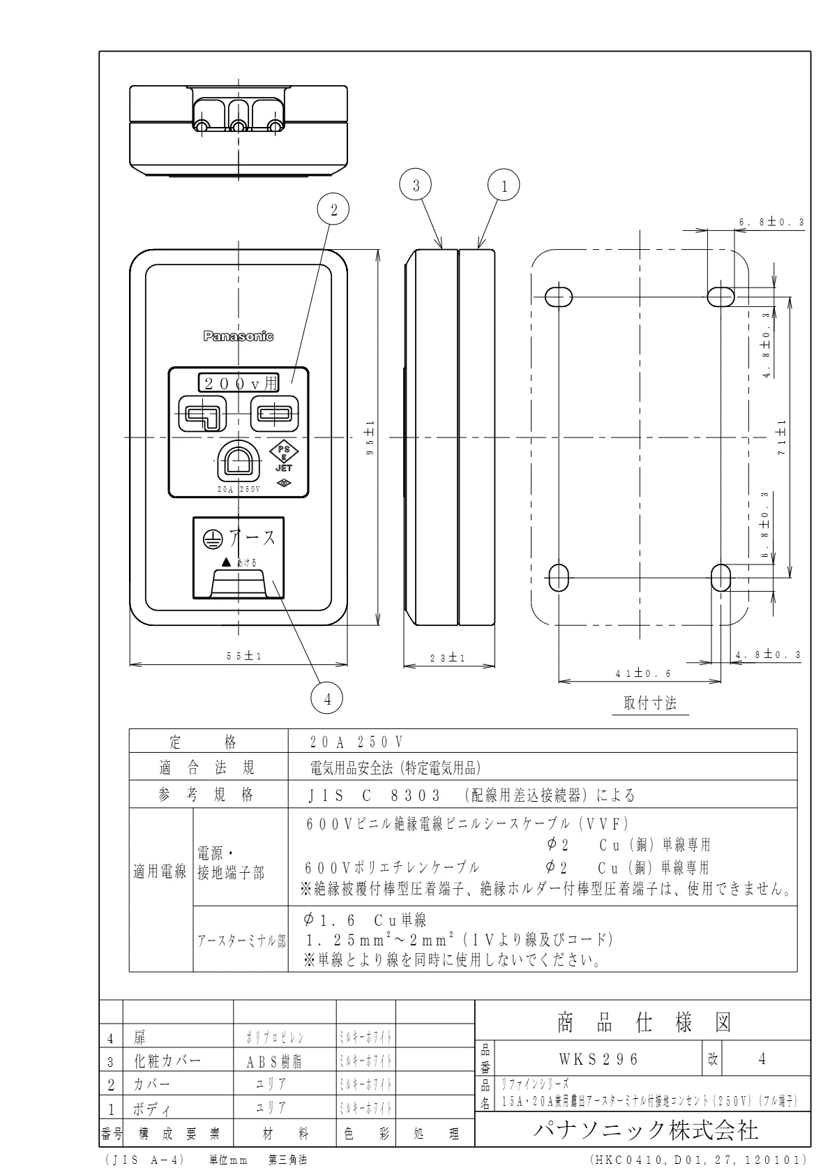 品番:WKS296品名:リファインシリーズ15A・20A兼用露出アースターミナル付接地コンセント20A250V(フル端子)