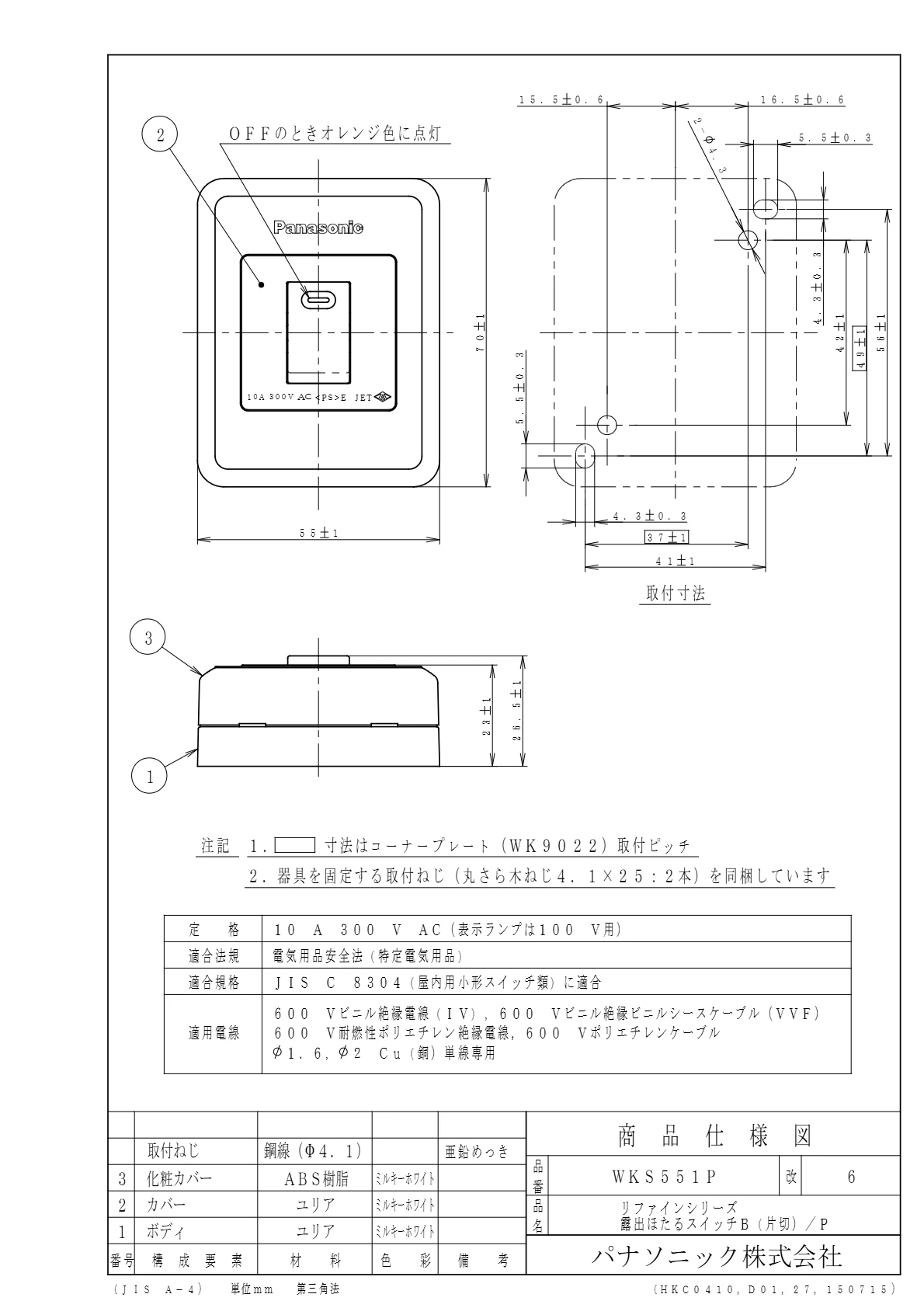 品番:WKS551P品名:リファインシリーズ露出ほたるスイッチB(片切)/プラスチック個装
