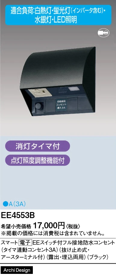 ![EE4553B スマート[電子]EEスイッチ付フル接地防水コンセント(タイマ連動コンセント3A)(抜け止め式・アースターミナル付)(露出・埋込両用)(ブラック)](/html/upload/save_image/EE4553B.webp)