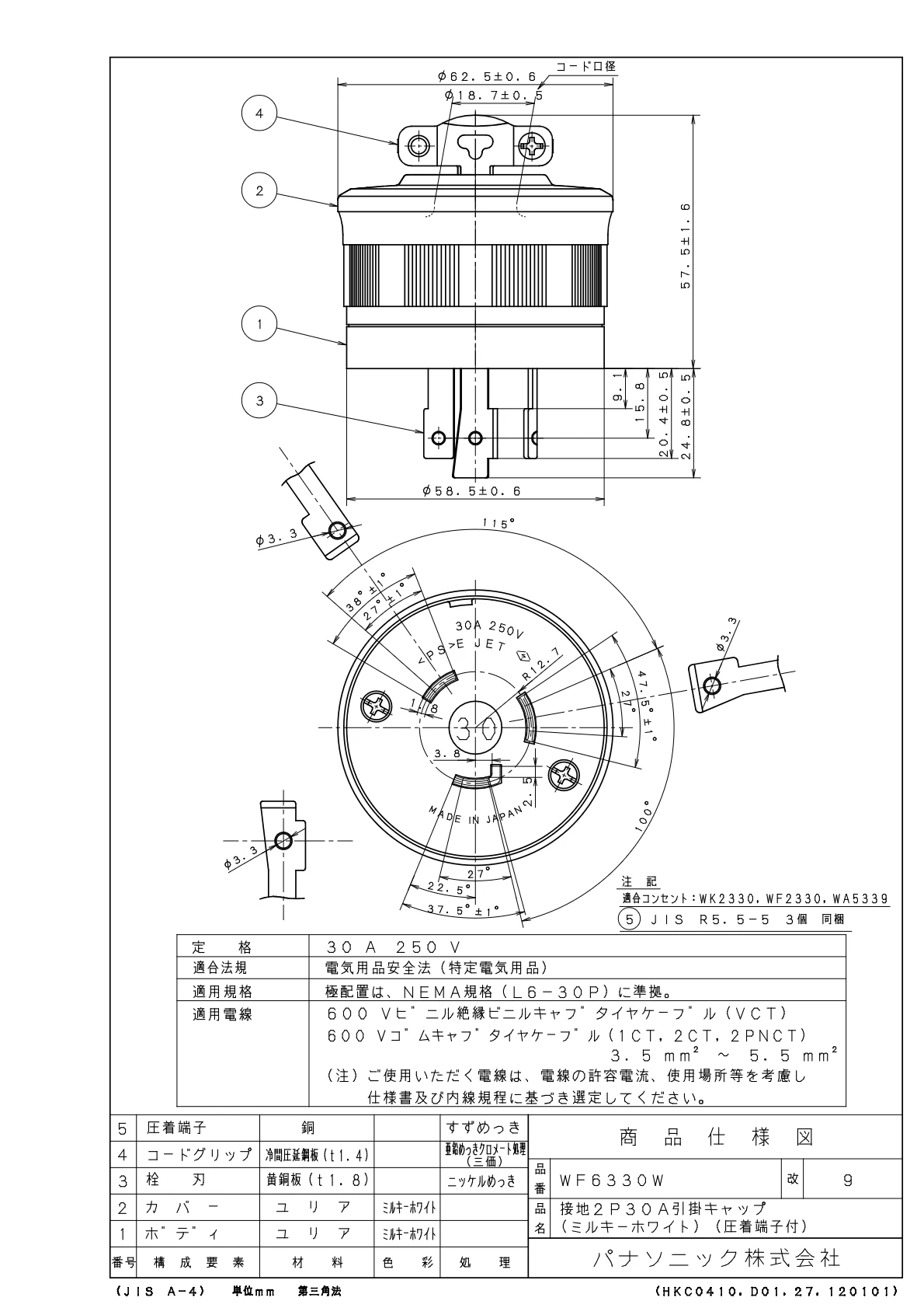 品番:WF6330W品名:接地2P30A引掛キャップ(コードグリップ付)(ミルキーホワイト)(圧着端子付)