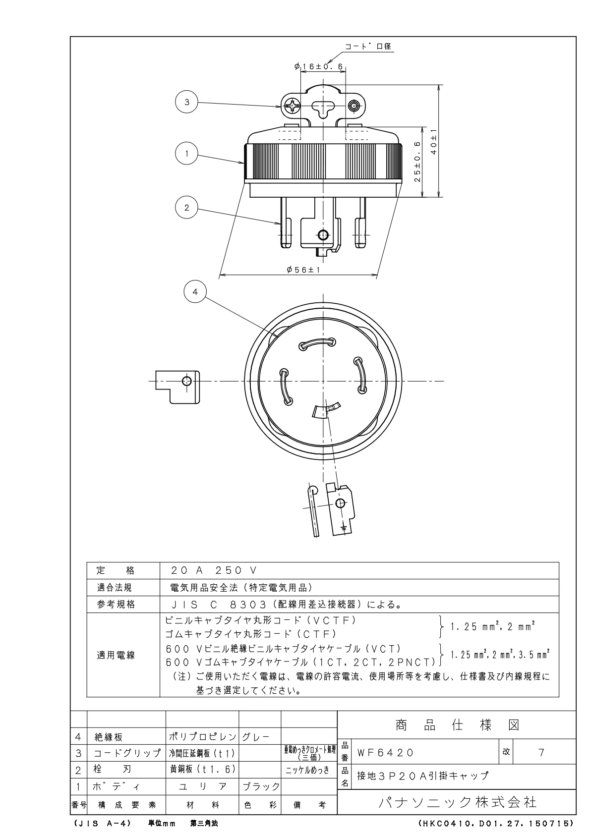 品番:WF6420品名:接地3P20A引掛キャップ(コードグリップ付)(ブラック)