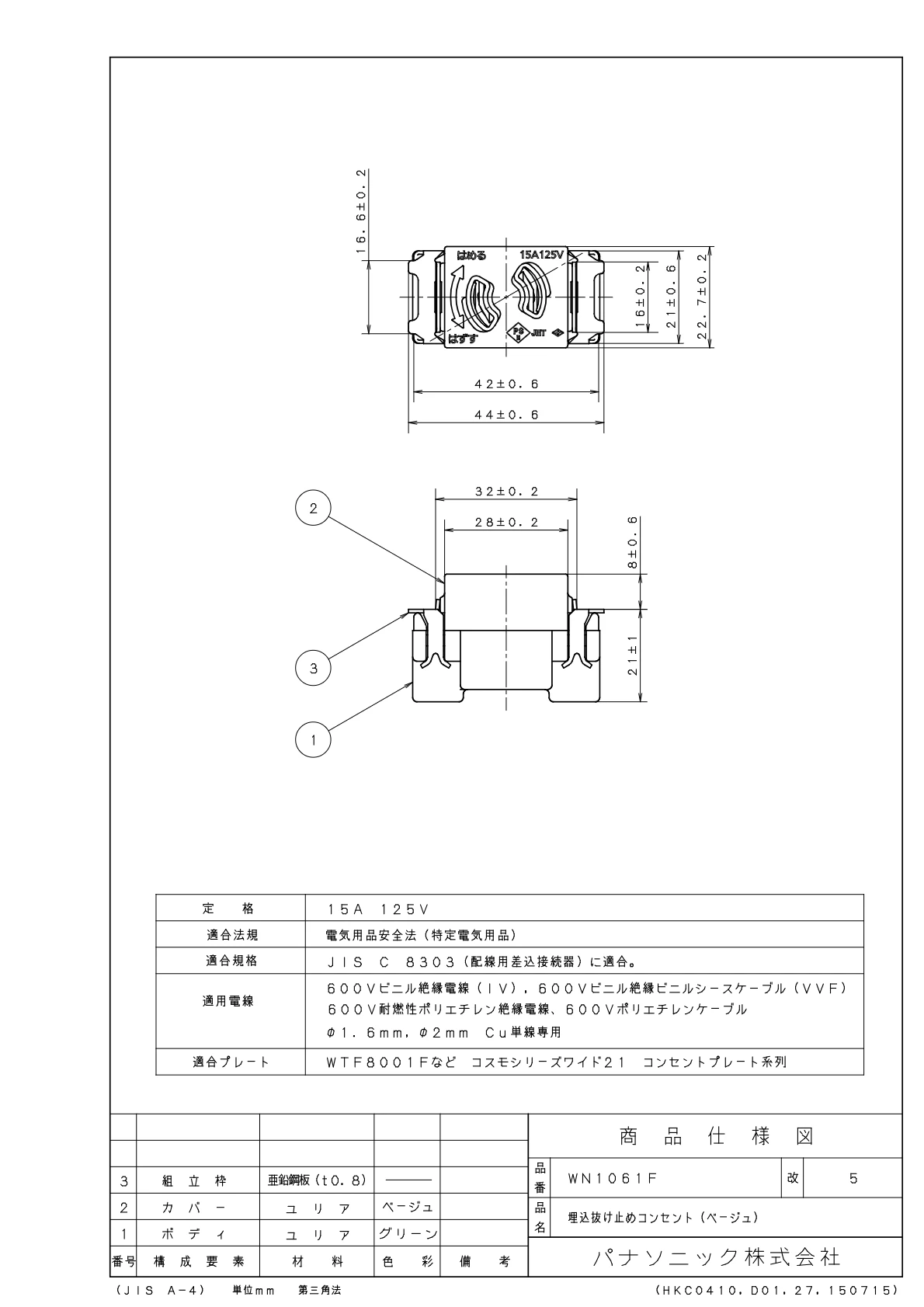 品番:WN1061F品名:埋込抜け止めコンセント(ベージュ)