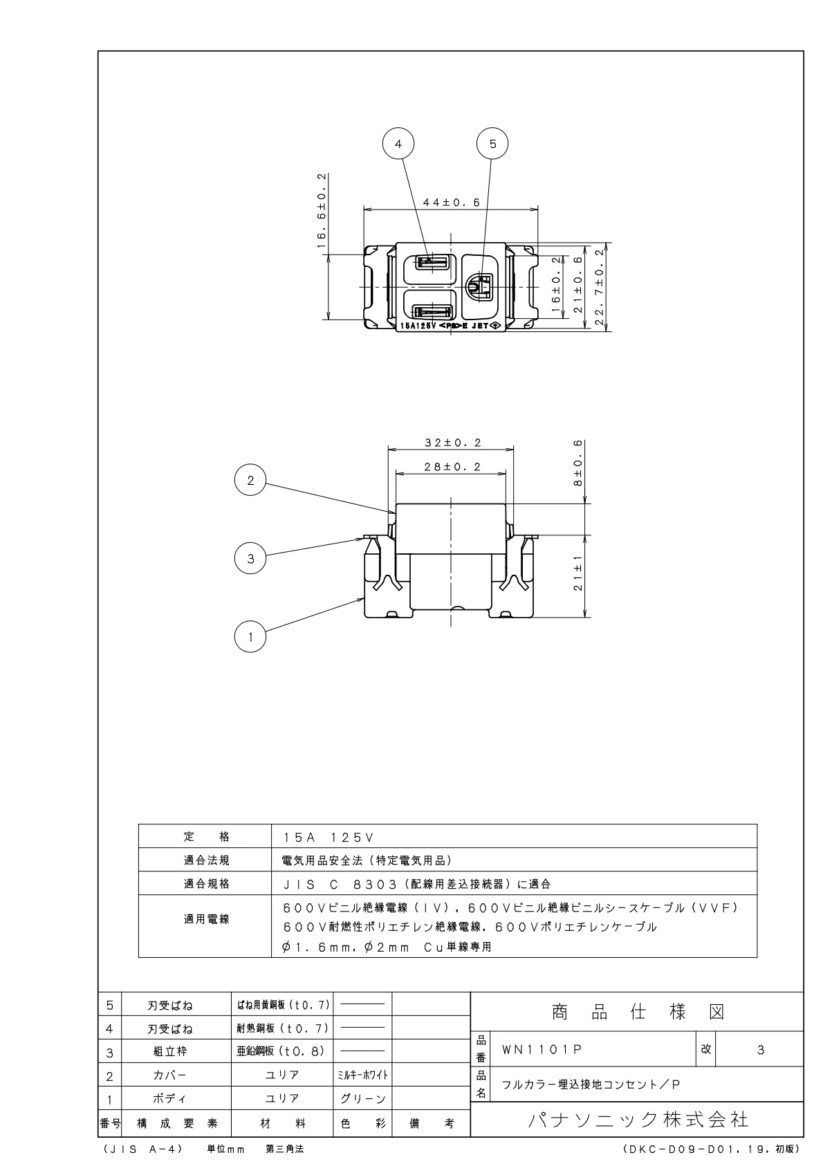 品番:WN1101P品名:埋込接地コンセント/プラスチック個装