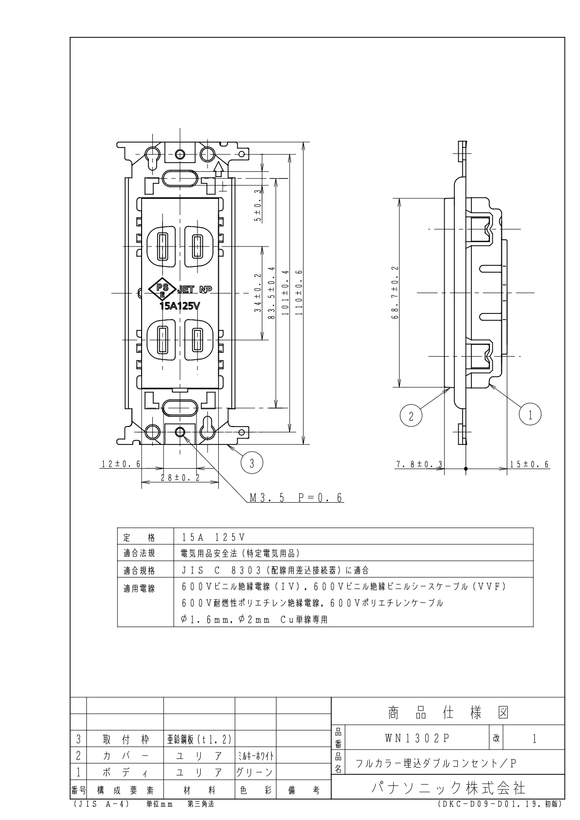 品番:WN1302P品名:埋込ダブルコンセント/プラスチック個装