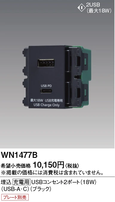 品番:WN1477B品名:埋込充電用USBコンセント2ポート(18W)(USB-A・C)(ブラック)