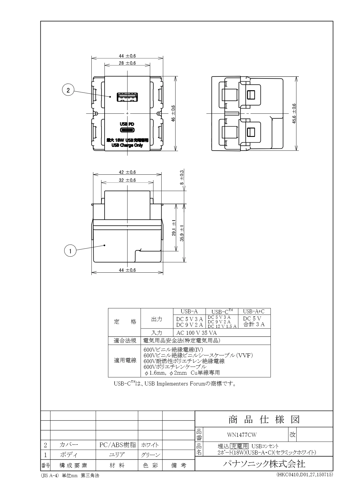 品番:WN1477CW品名:埋込充電用USBコンセント2ポート(18W)(USB-A・C)(セラミックホワイト)