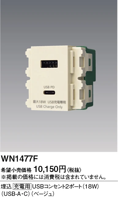 品番:WN1477F品名:埋込充電用USBコンセント2ポート(18W)(USB-A・C)(ベージュ)
