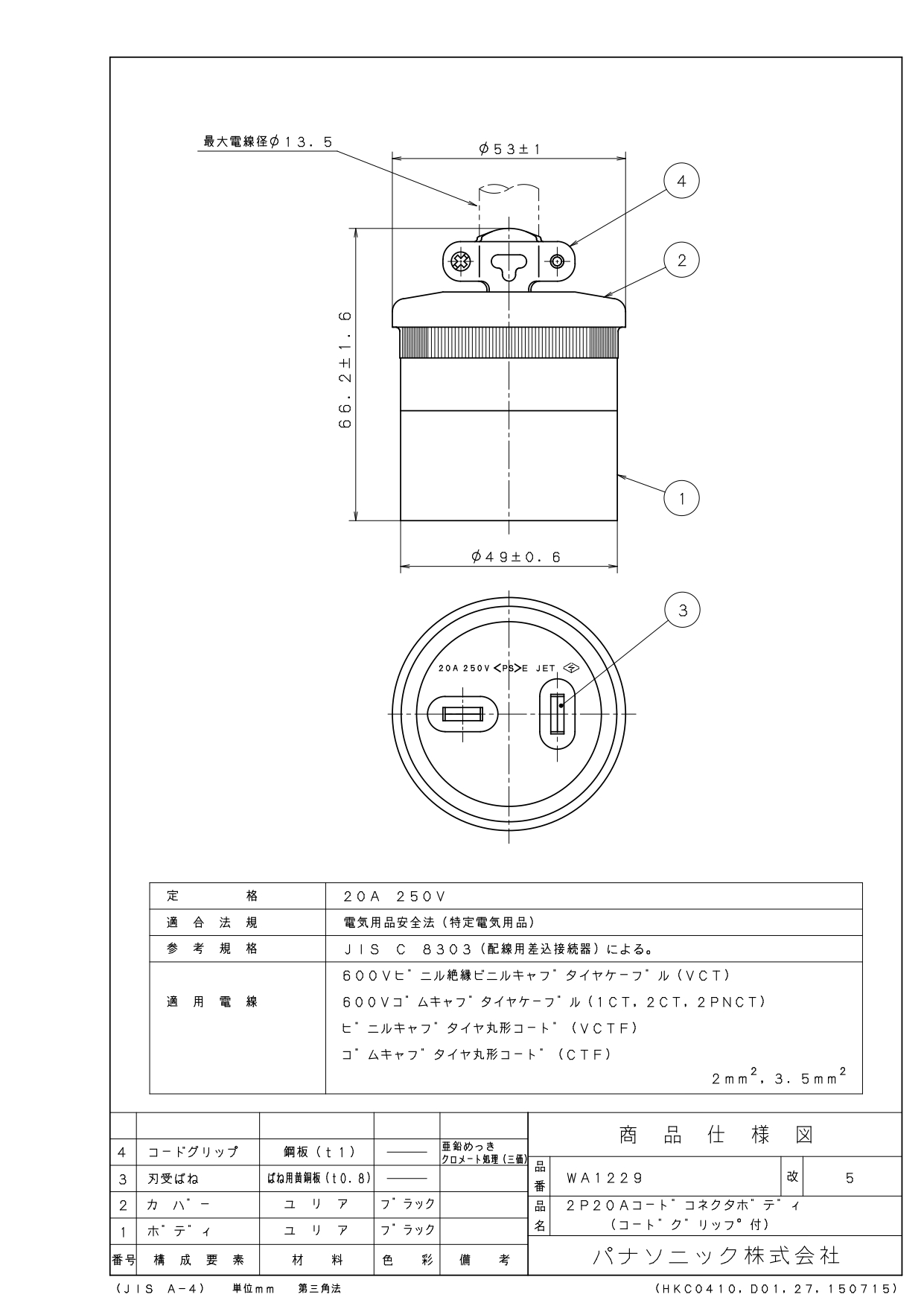 品番:WA1229品名:2P20Aコードコネクタボディ(コードグリップ付)