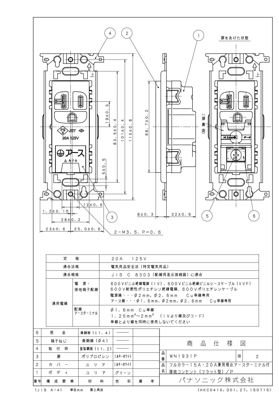 品番:WN1931P品名:埋込15A・20A兼用埋込アースターミナル付接地コンセント/プラスチック個装