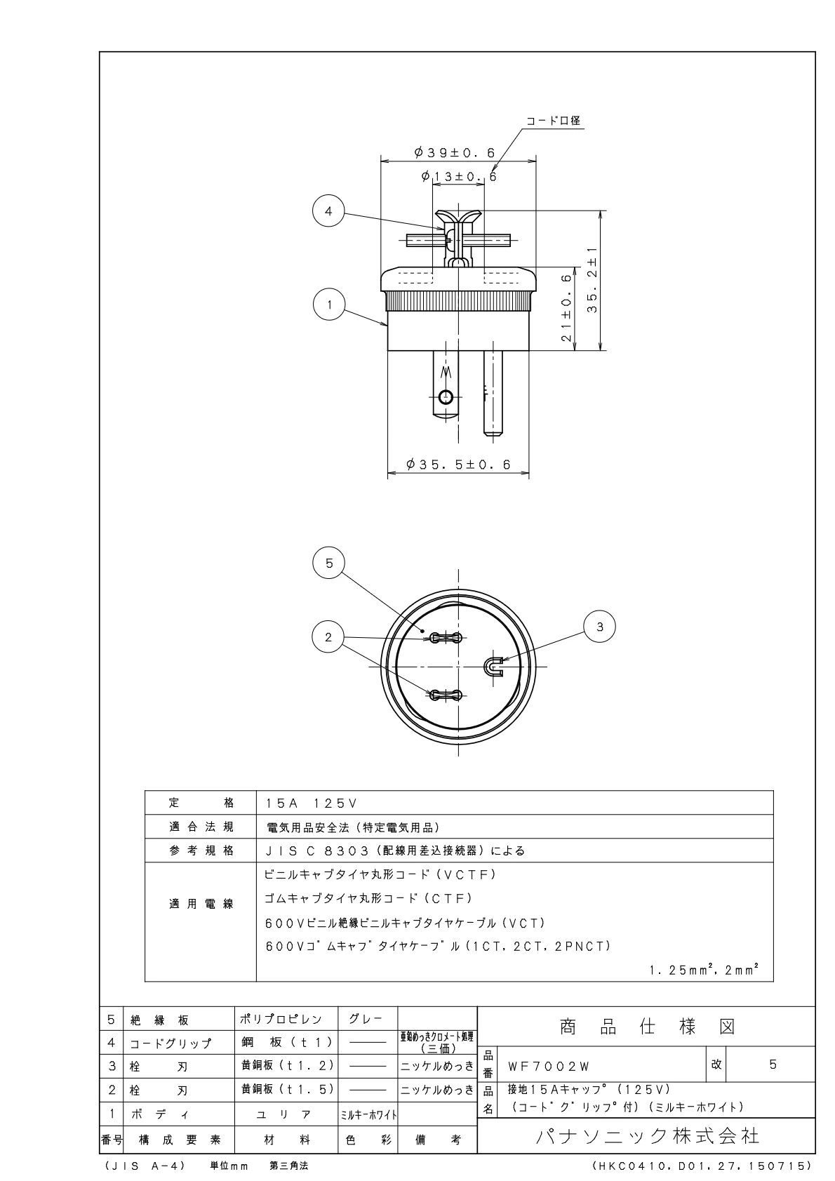 品番:WF7002W品名:接地15Aキャップ(コードグリップ付)(ミルキーホワイト)