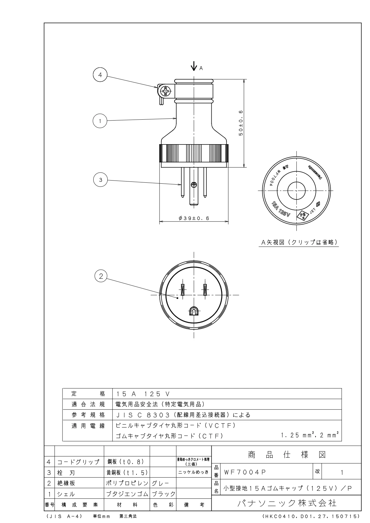 品番:WF7004P品名:小型接地15Aゴムキャップ(125V)/プラスチック個装