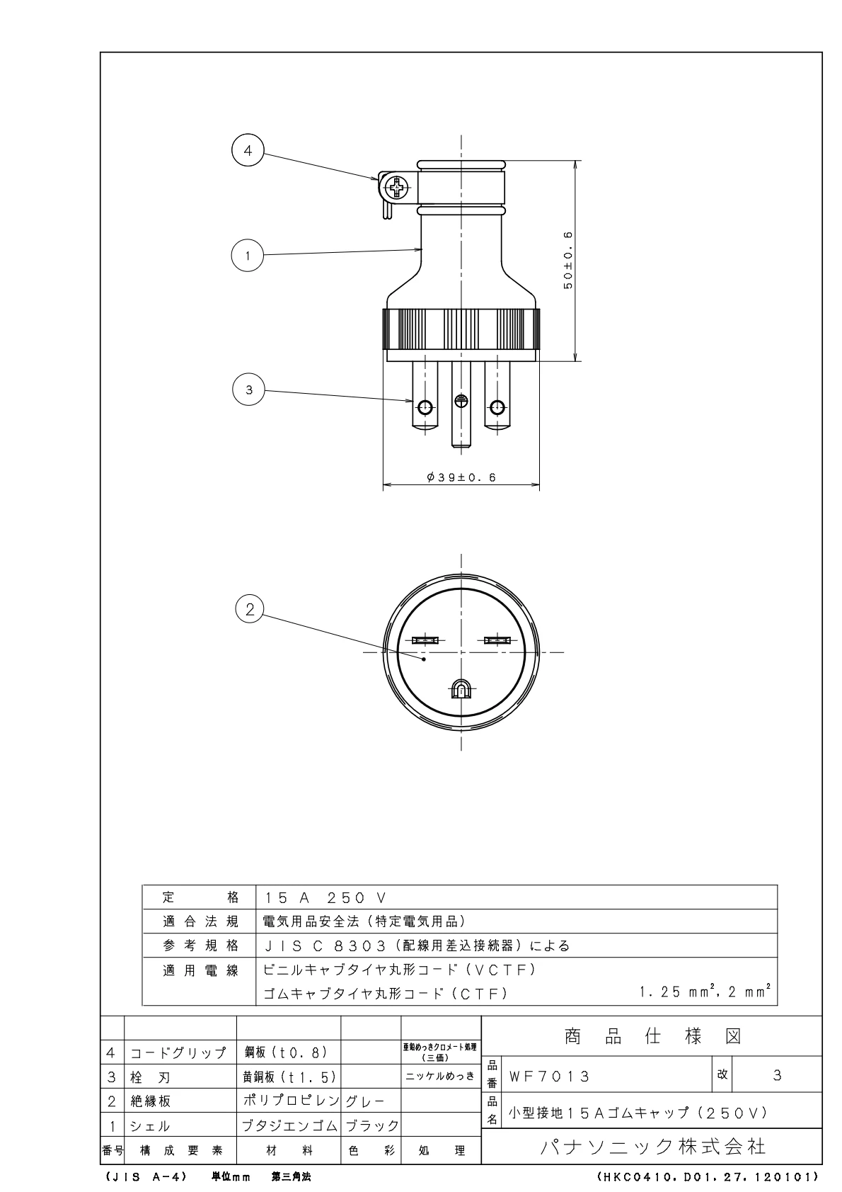 品番:WF7013品名:小型接地15Aゴムキャップ(250V)