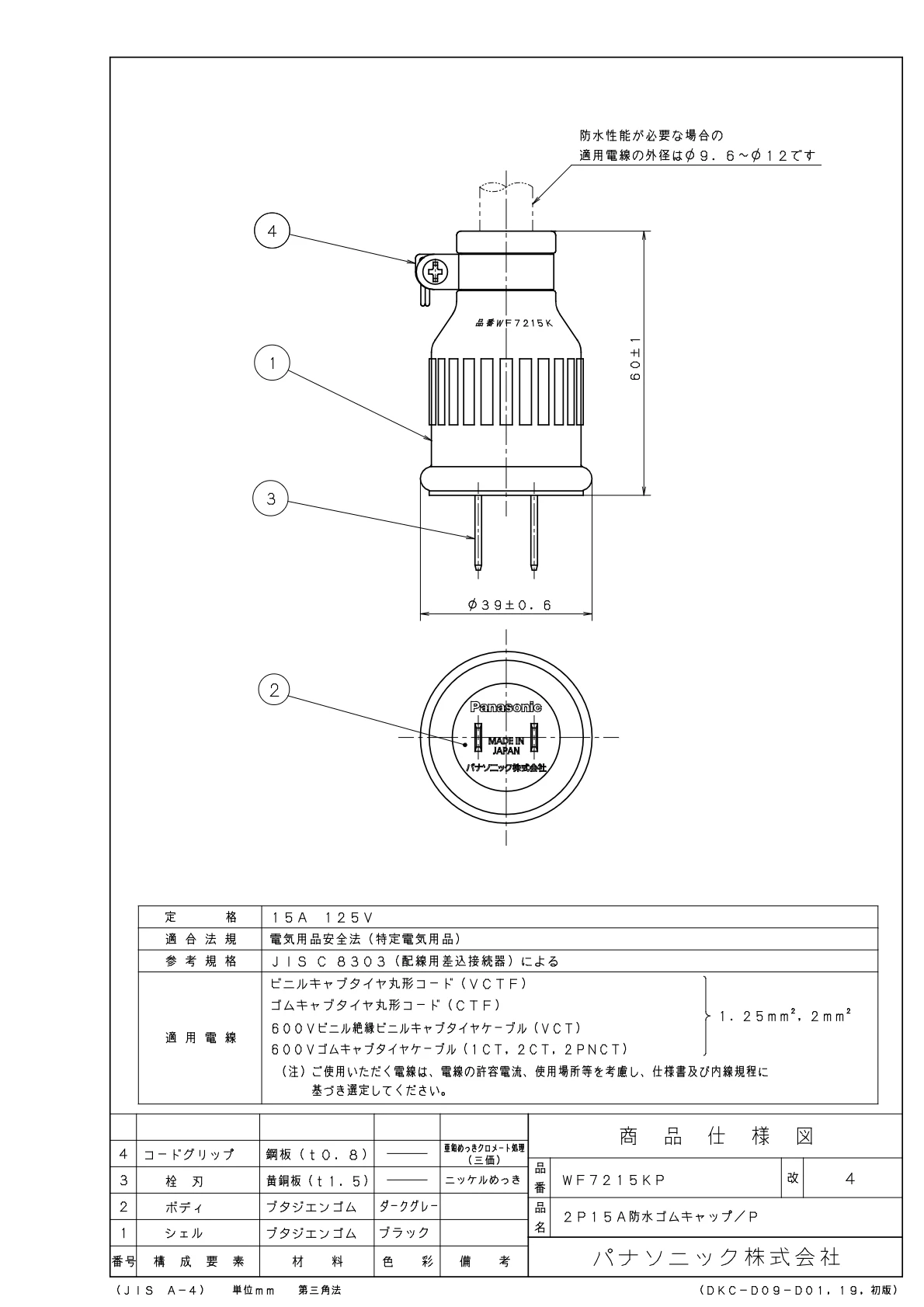 品番:WF7215KP品名:2P15A防水ゴムキャップ/プラスチック個装