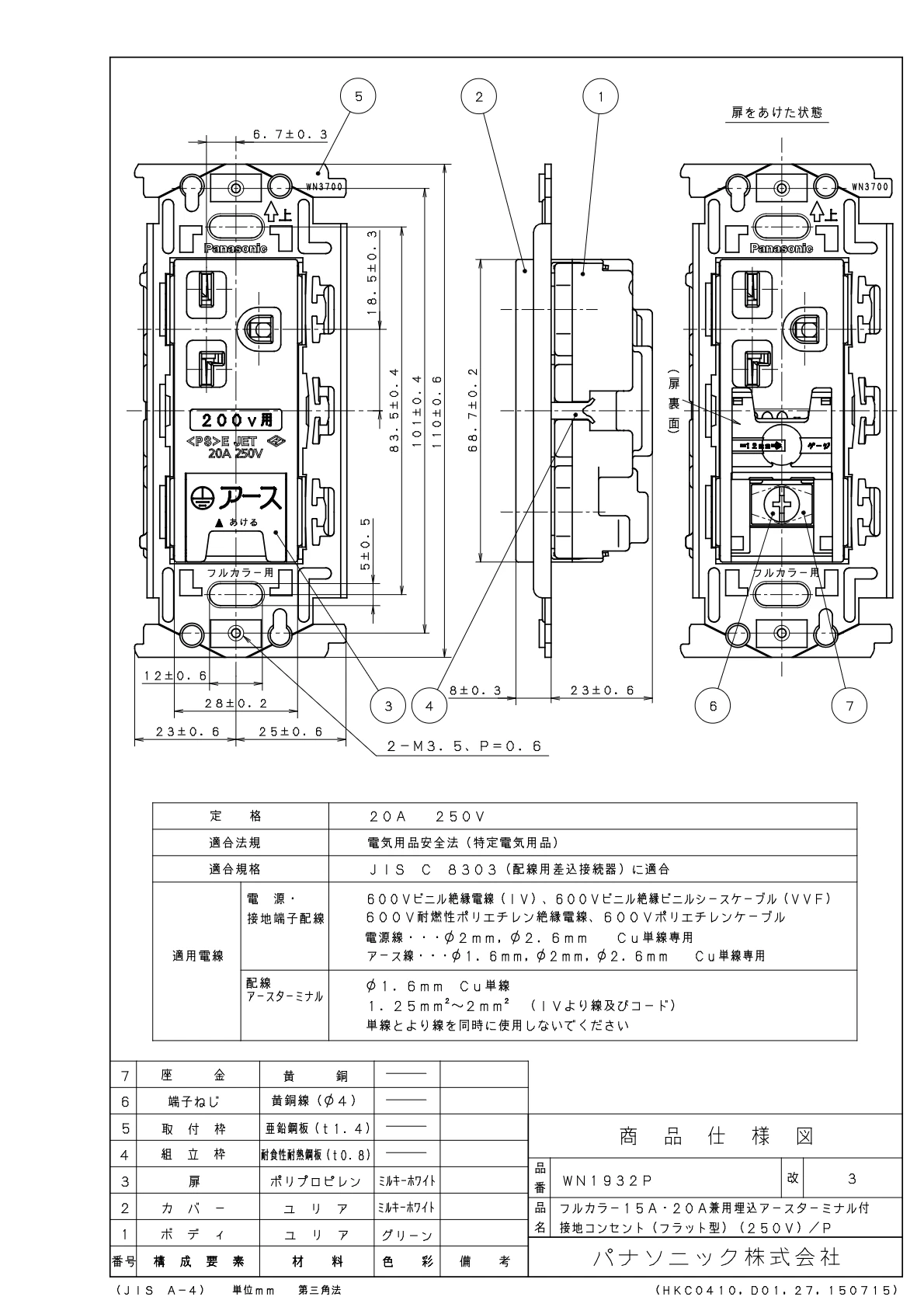 品番:WN1932P品名:埋込15A・20A兼用埋込アースターミナル付接地コンセント(フラット型)(250V)/プラスチック個装