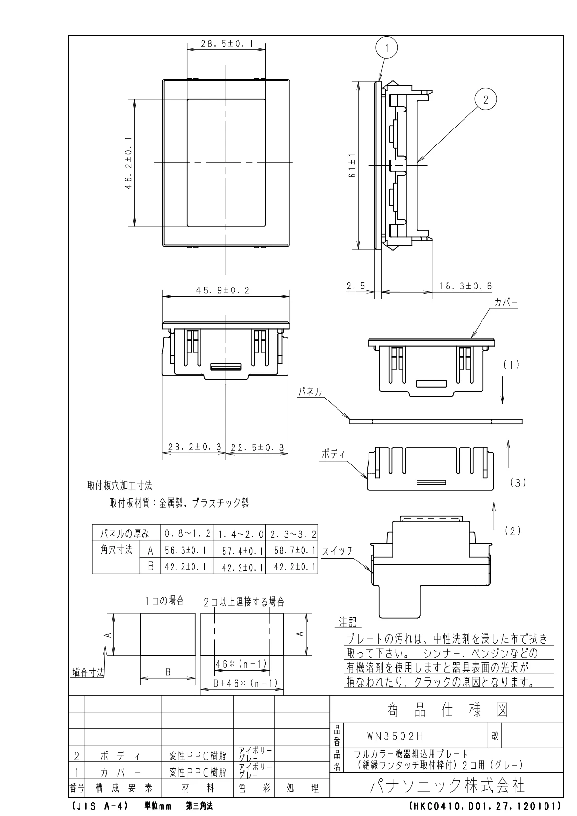 品番:WN3502H品名:フルカラー機器組込用プレート(絶縁ワンタッチ取付枠付)(2コ用)(グレー)