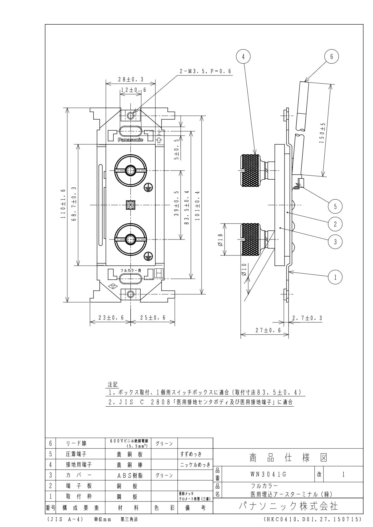 品番:WN3041G品名:フルカラー医用埋込アースターミナル(緑)