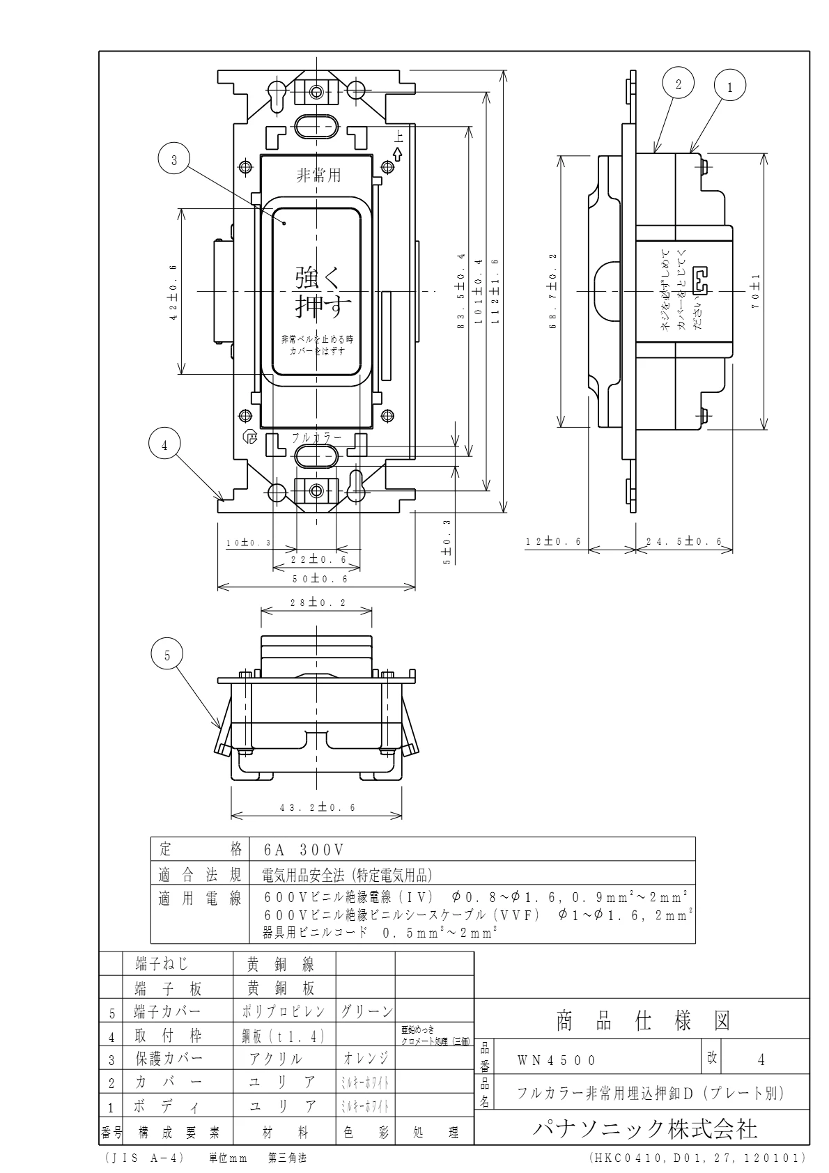 品番:WN4500品名:非常用埋込押釦D(両切)(プレート別)