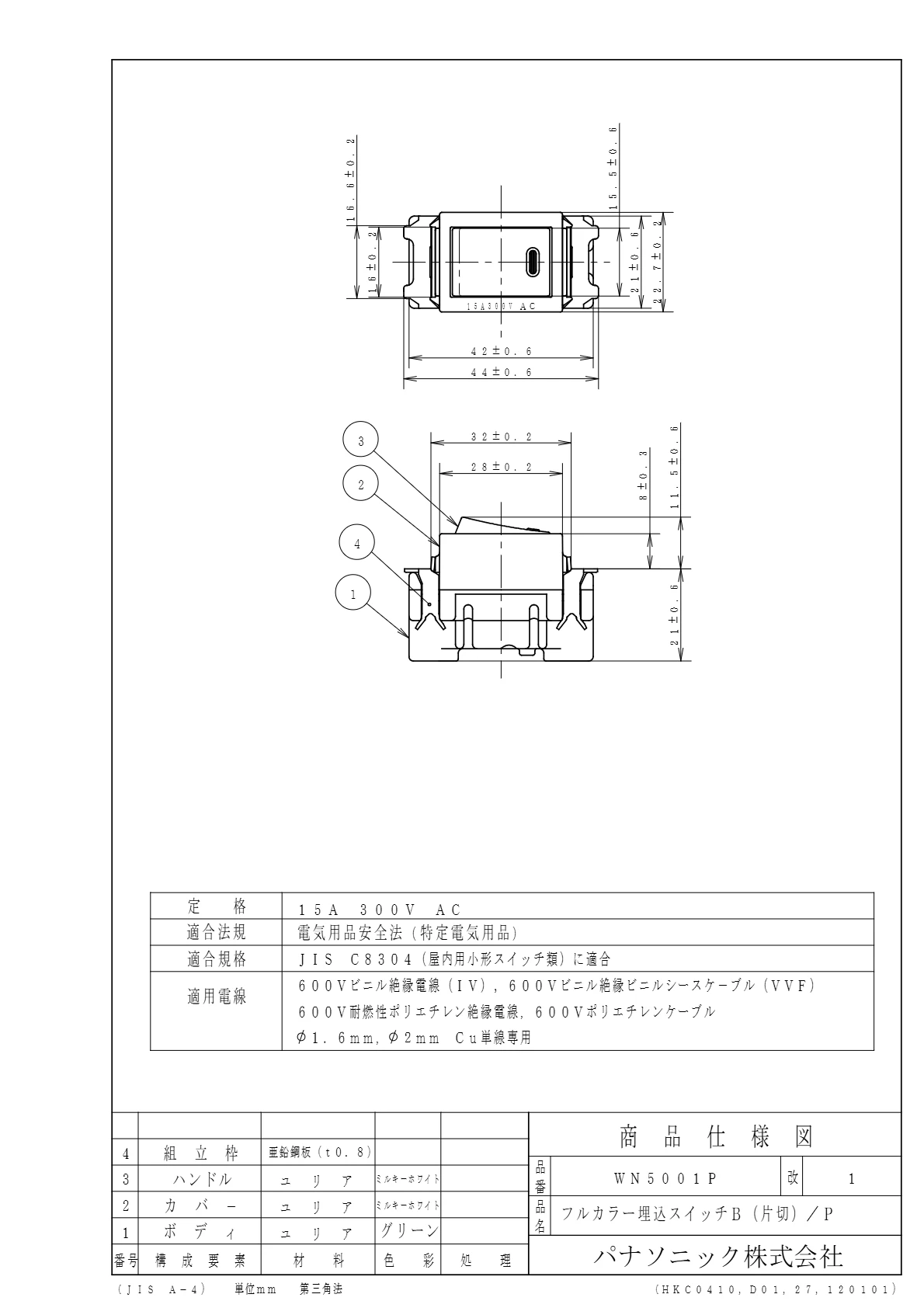 品番:WN5001P品名:埋込スイッチB(片切)/プラスチック個装