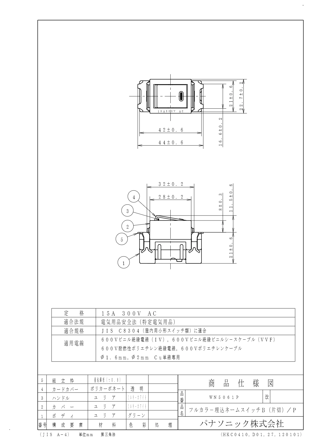 品番:WN5061P品名:埋込ネームスイッチB(片切)/プラスチック個装