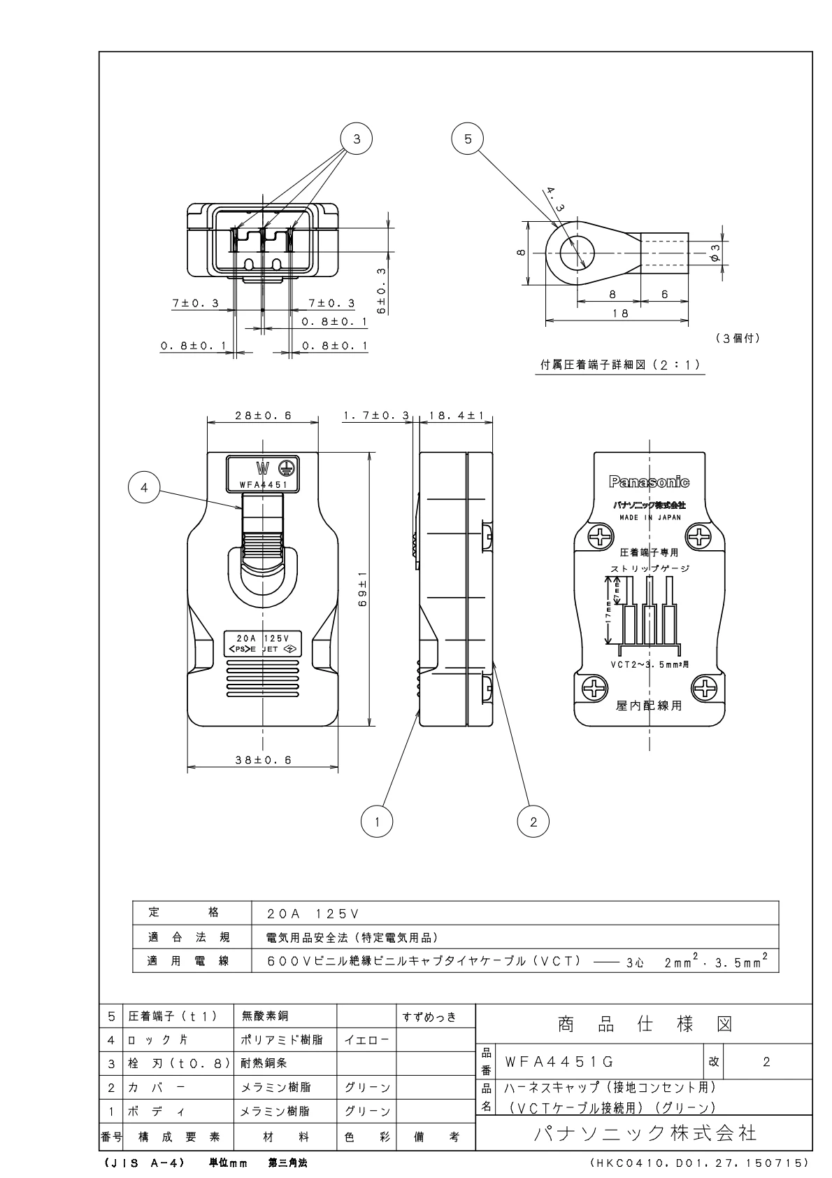 品番:WFA4451G品名:ハーネスキャップ(接地コンセント用)(VCTケーブル接続用)