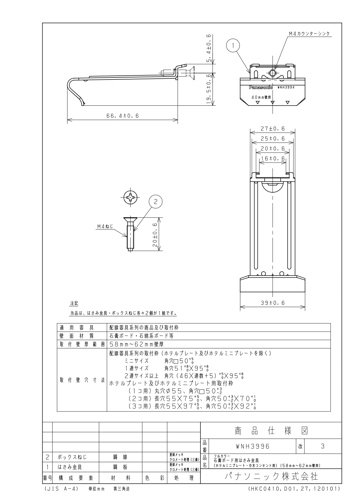 品番:WNH3996品名:石膏ボード用はさみ金具(ホテルミニプレート・(58-62MM壁用)