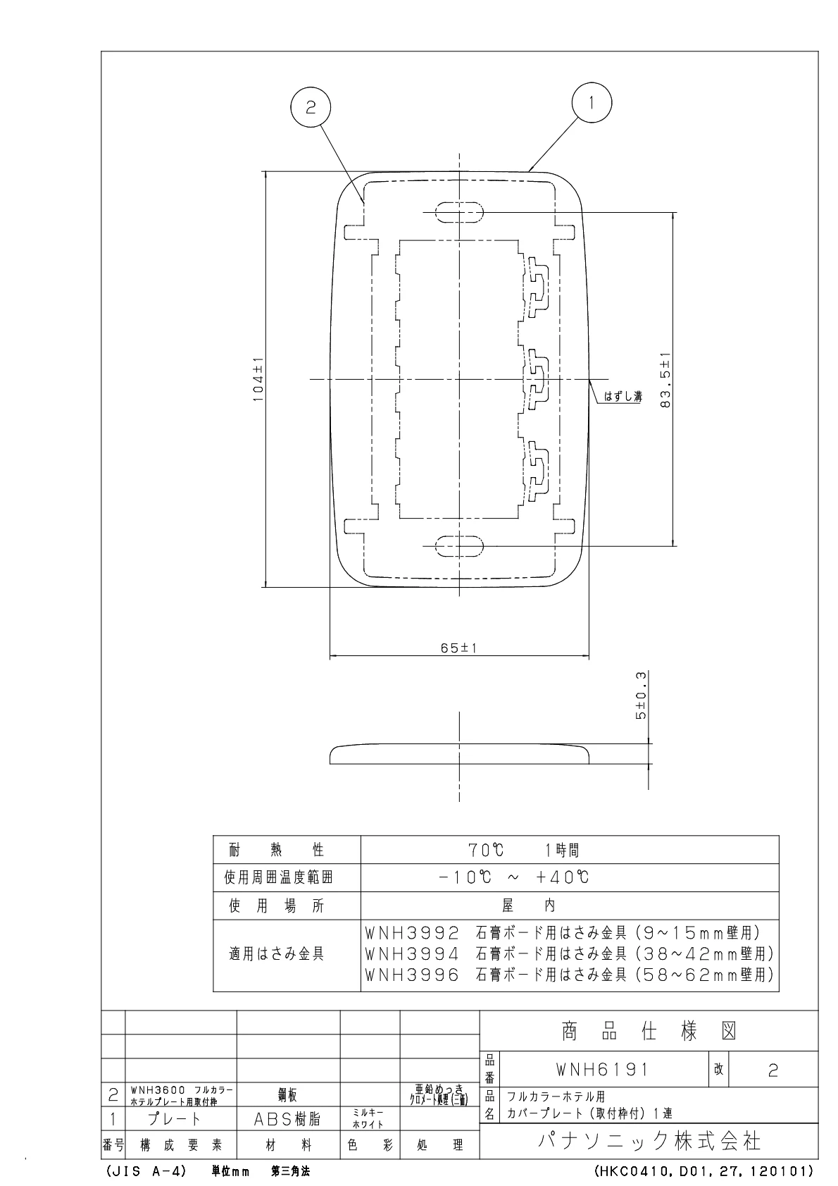 品番:WNH6191品名:ホテル用カバープレート(取付枠付)1連