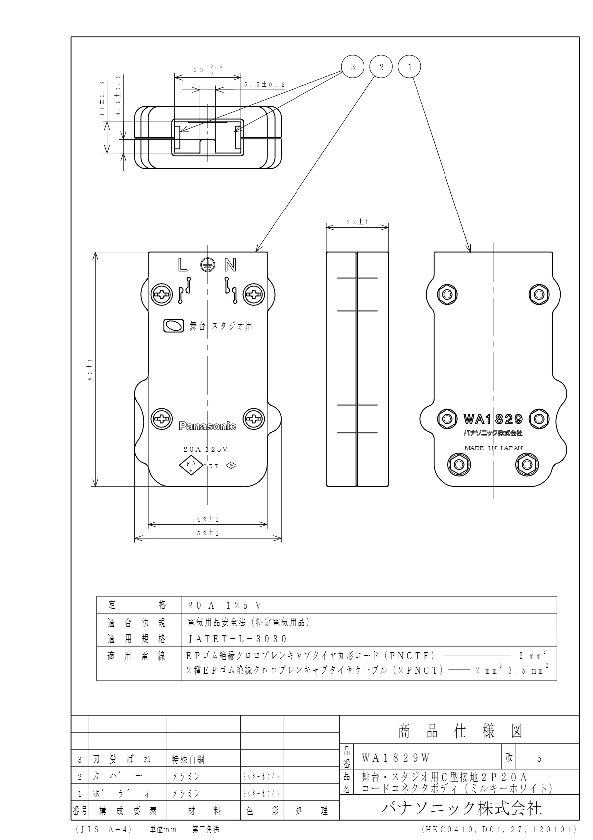 品番:WA1829W品名:舞台照明用C型接地2P20Aコードコネクタボディ(ミルキーホワイト)