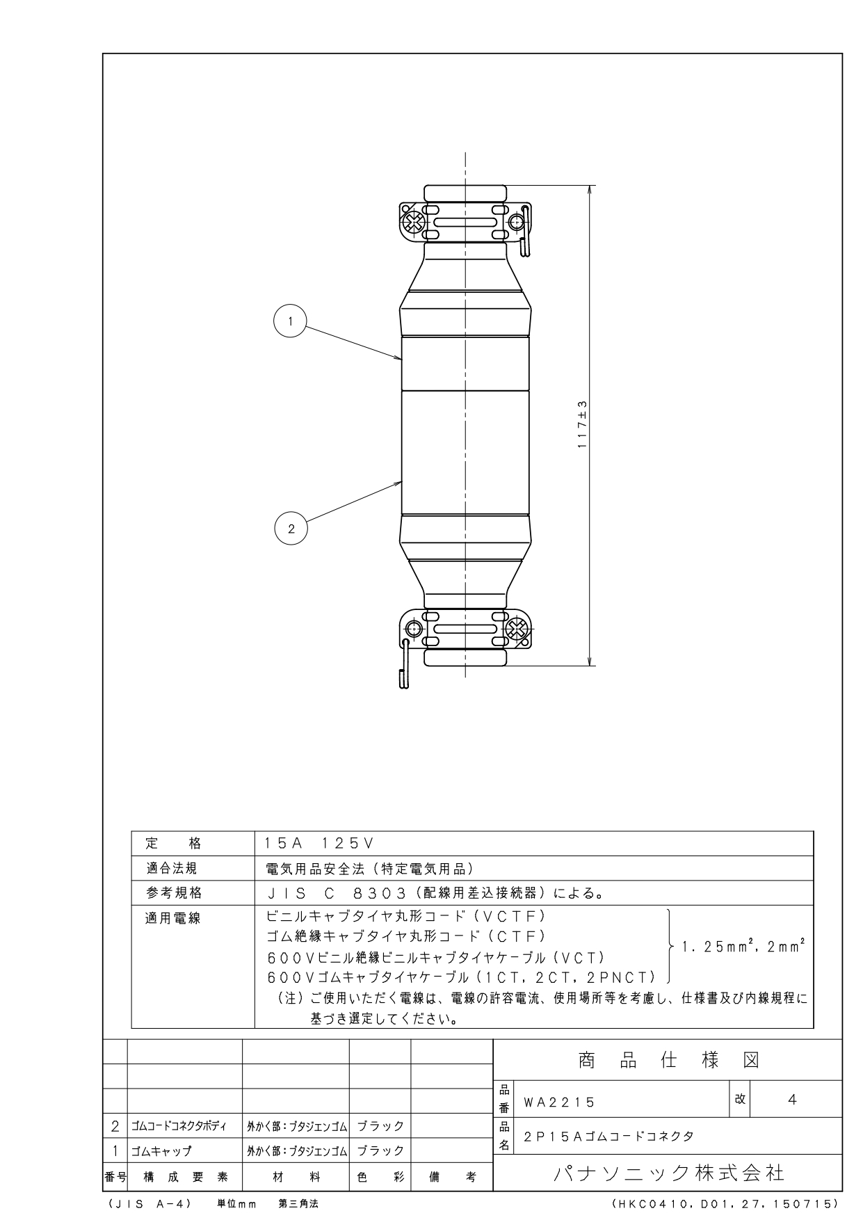 品番:WA2215品名:2P15Aゴムコードコネクタ