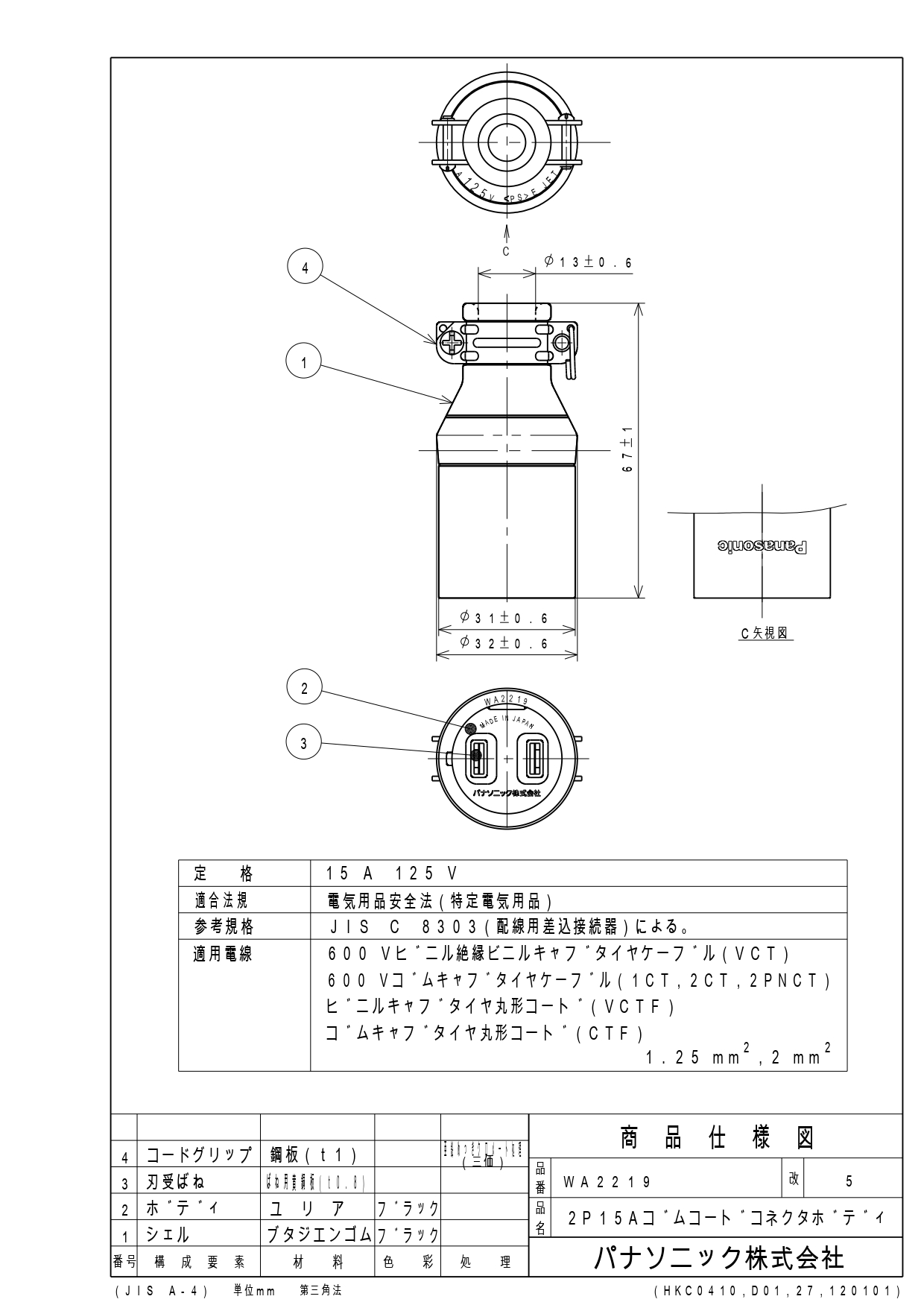 品番:WA2219品名:2P15Aゴムコードコネクタボディ