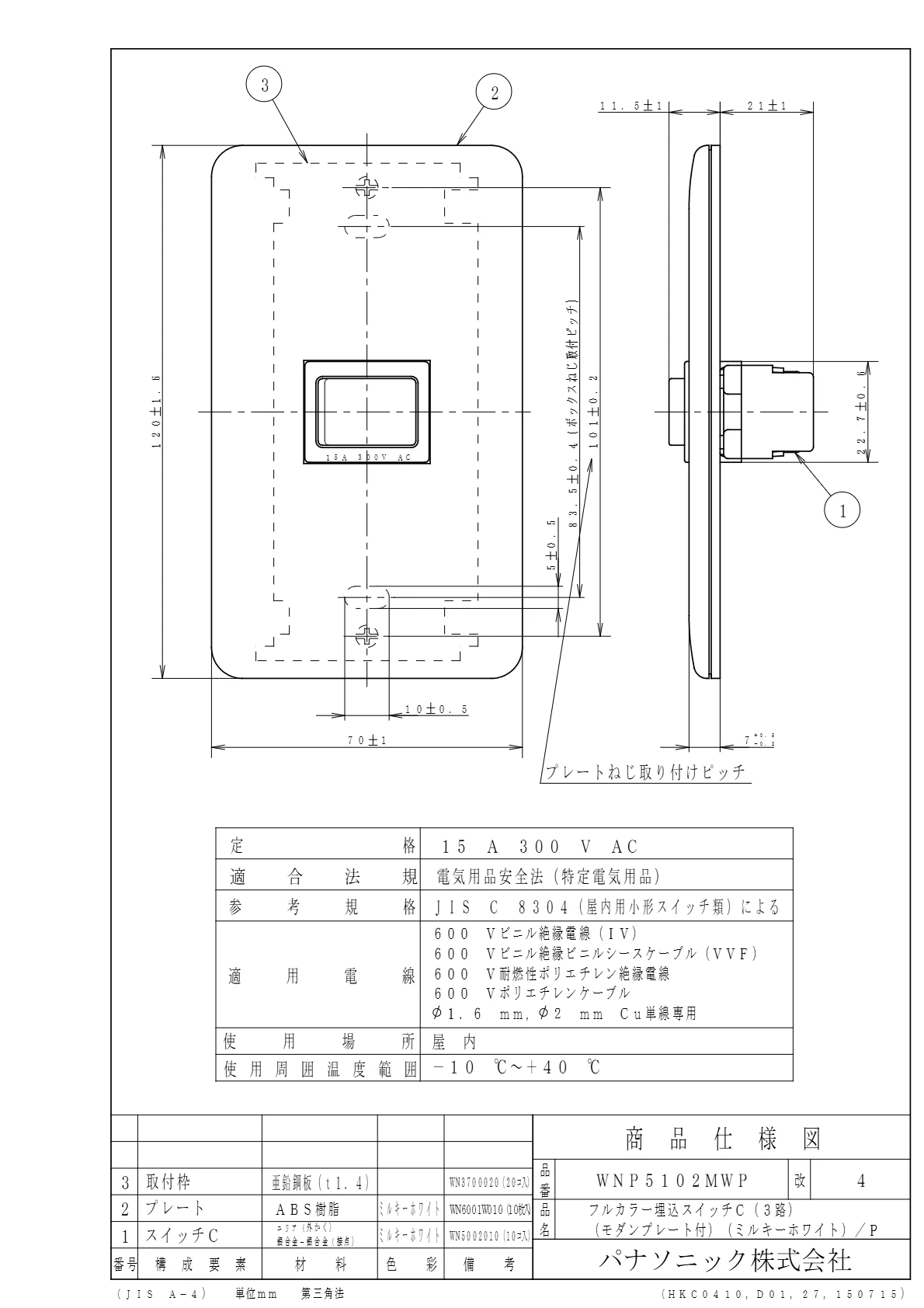 品番:WNP5102MWP品名:埋込スイッチC(3路)(モダンプレート付(ミルキーホワイト)/プラスチック個装