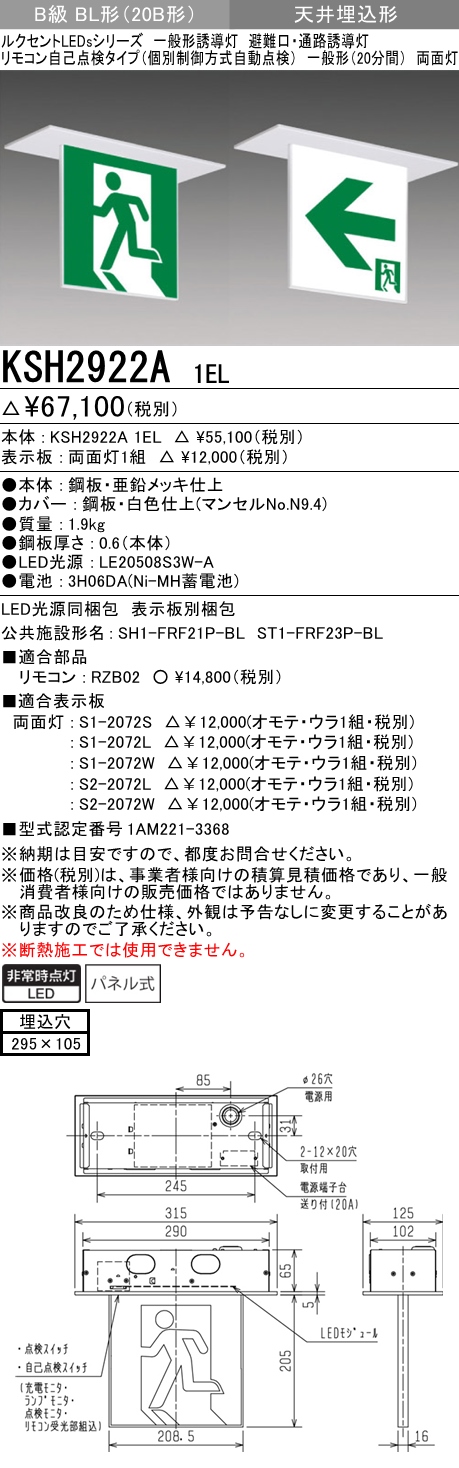 KSH2922A 1EL+S1-2072L 非常口・避難口誘導灯(天井埋込型)B級BL形(20B形)両面型セット(矢印パネル付)