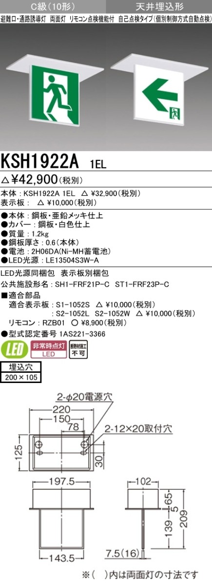 KSH1922A 1EL+S2-1052W 通路誘導灯(天井埋込型)C級(10形)両面型セット