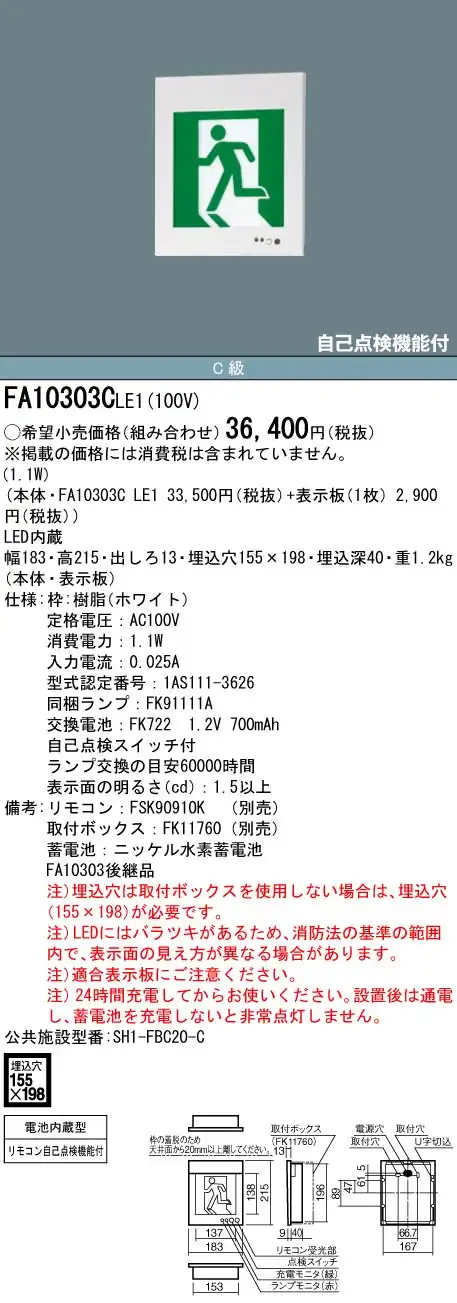 FA10303CLE1+FK10300 非常口・避難口誘導灯(壁埋込型)C級(10形)片面型セット(左向パネル付)