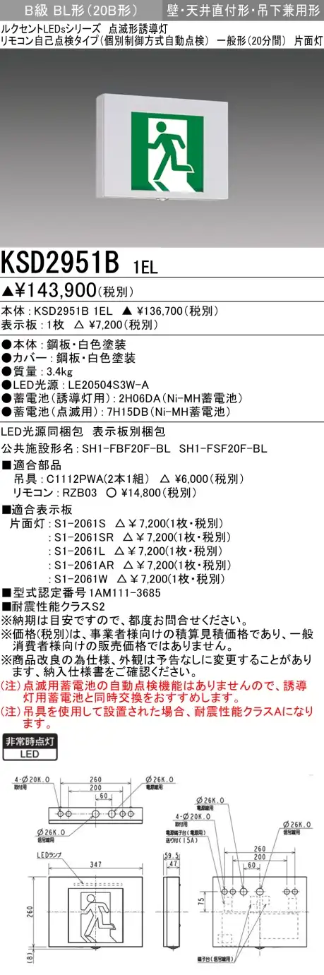 KSD2951B 1EL+S1-2061L 非常口・避難口誘導灯 点滅形 B級BL形(20B形)片面型セット(左向・左矢印パネル付)