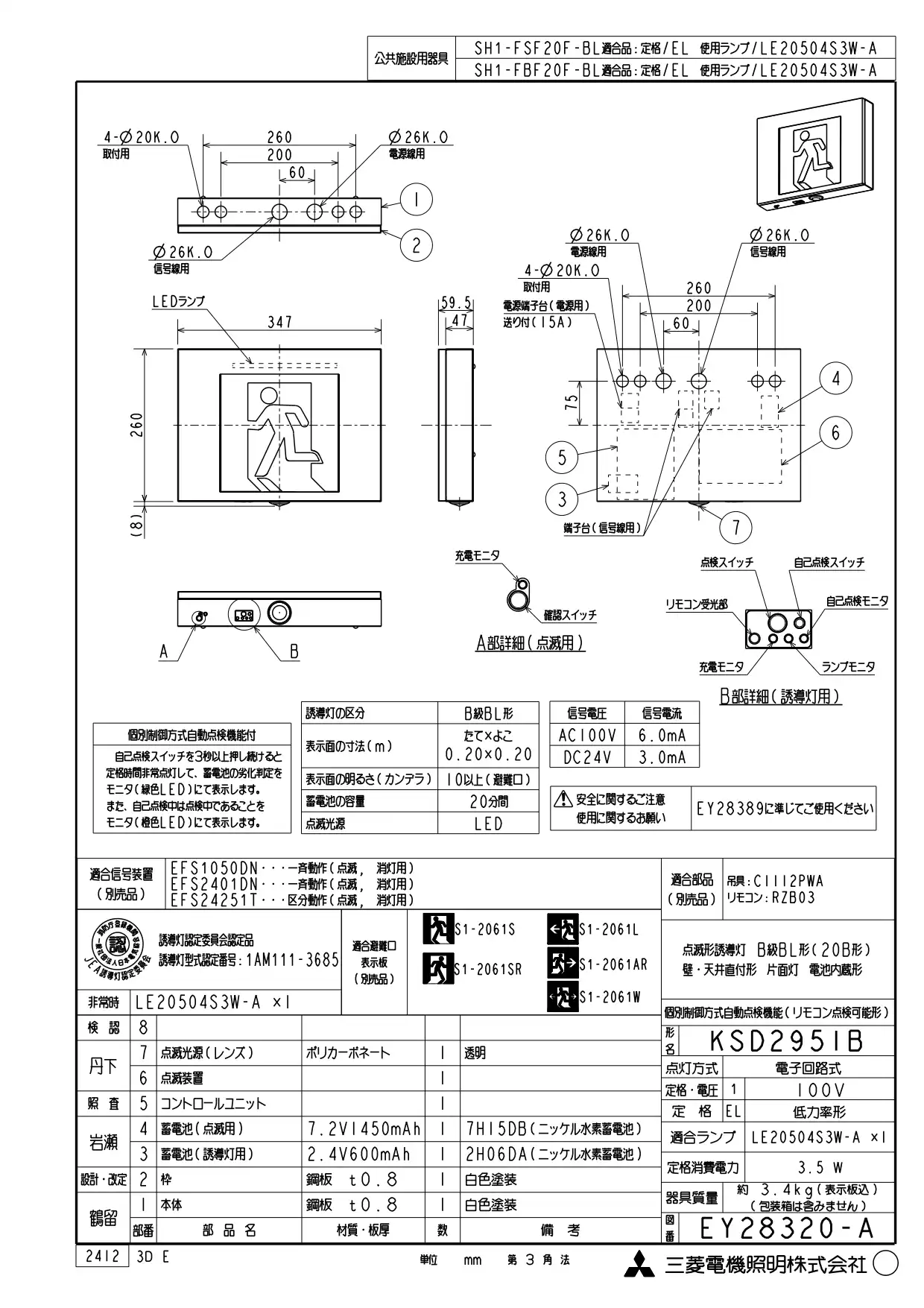 - 誘導灯(非常灯) > 点滅形 > 壁・天井直付型・吊下型 > 避難口誘導灯 > 三菱電機B級・BL形