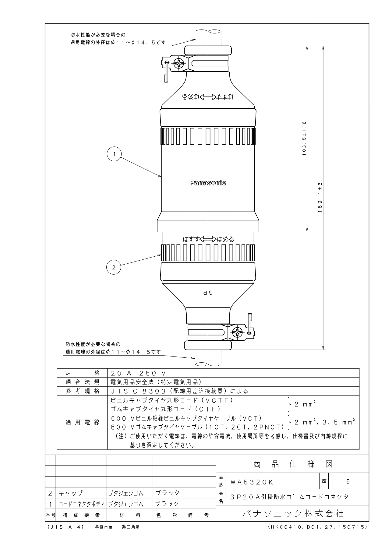品番:WA5320K品名:3P20A引掛防水ゴムコードコネクタ