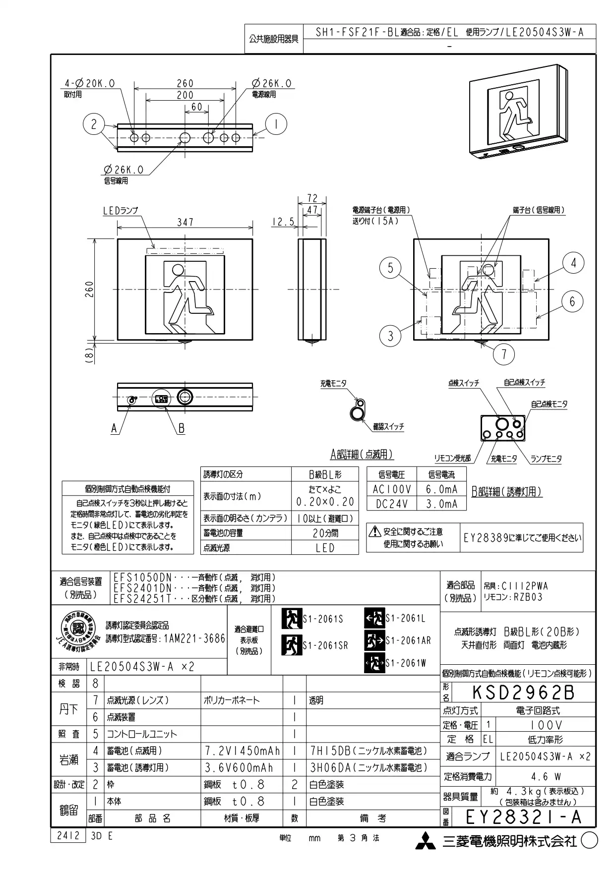 - 誘導灯(非常灯) > 点滅形 > 壁・天井直付型・吊下型 > 避難口誘導灯 > 三菱電機B級・BL形