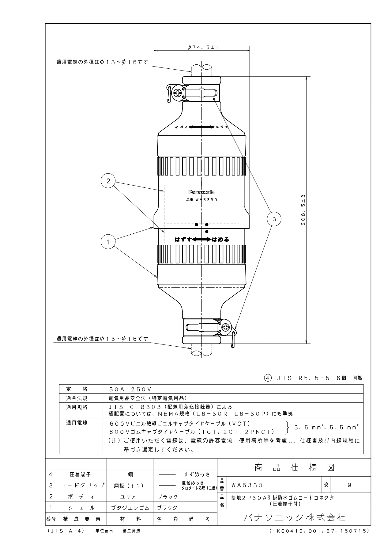 品番:WA5330品名:接地2P30A引掛防水ゴムコードコネクタ(圧着端子付)