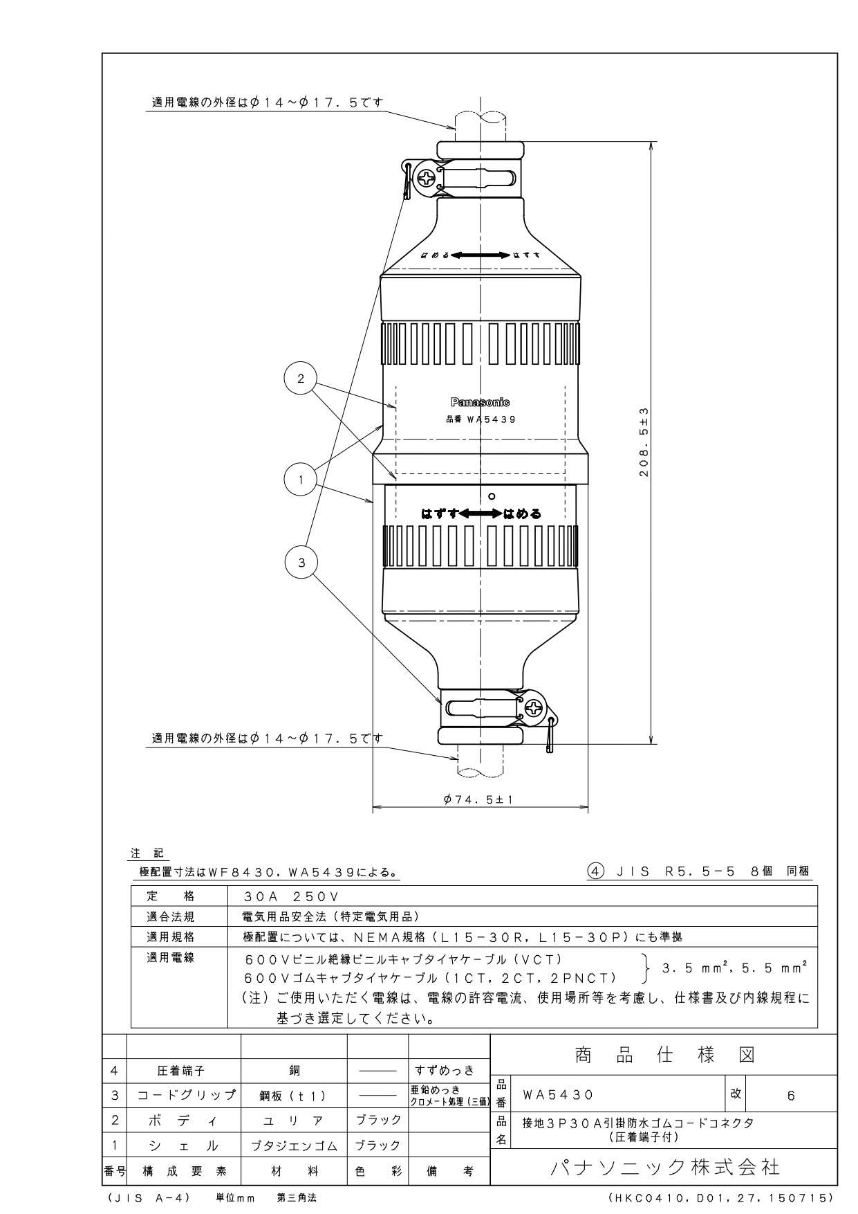 品番:WA5430品名:接地3P30A引掛防水ゴムコードコネクタ(圧着端子付)