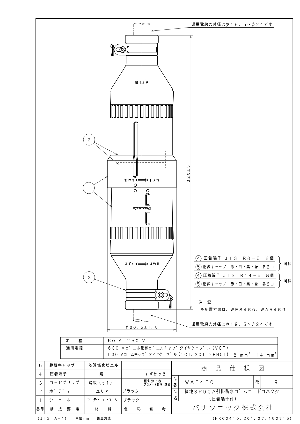 品番:WA5460品名:接地3P60A引掛防水ゴムコードコネクタ(圧着端子付)