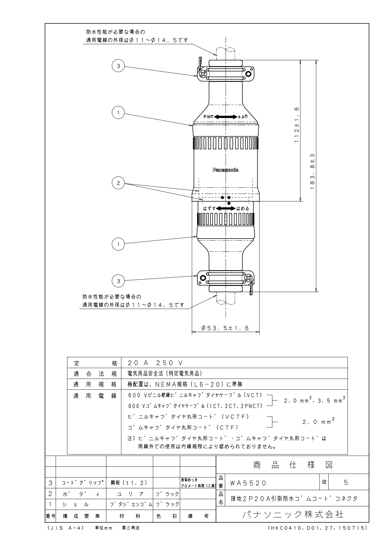 品番:WA5520品名:接地2P20A引掛防水ゴムコードコネクタ
