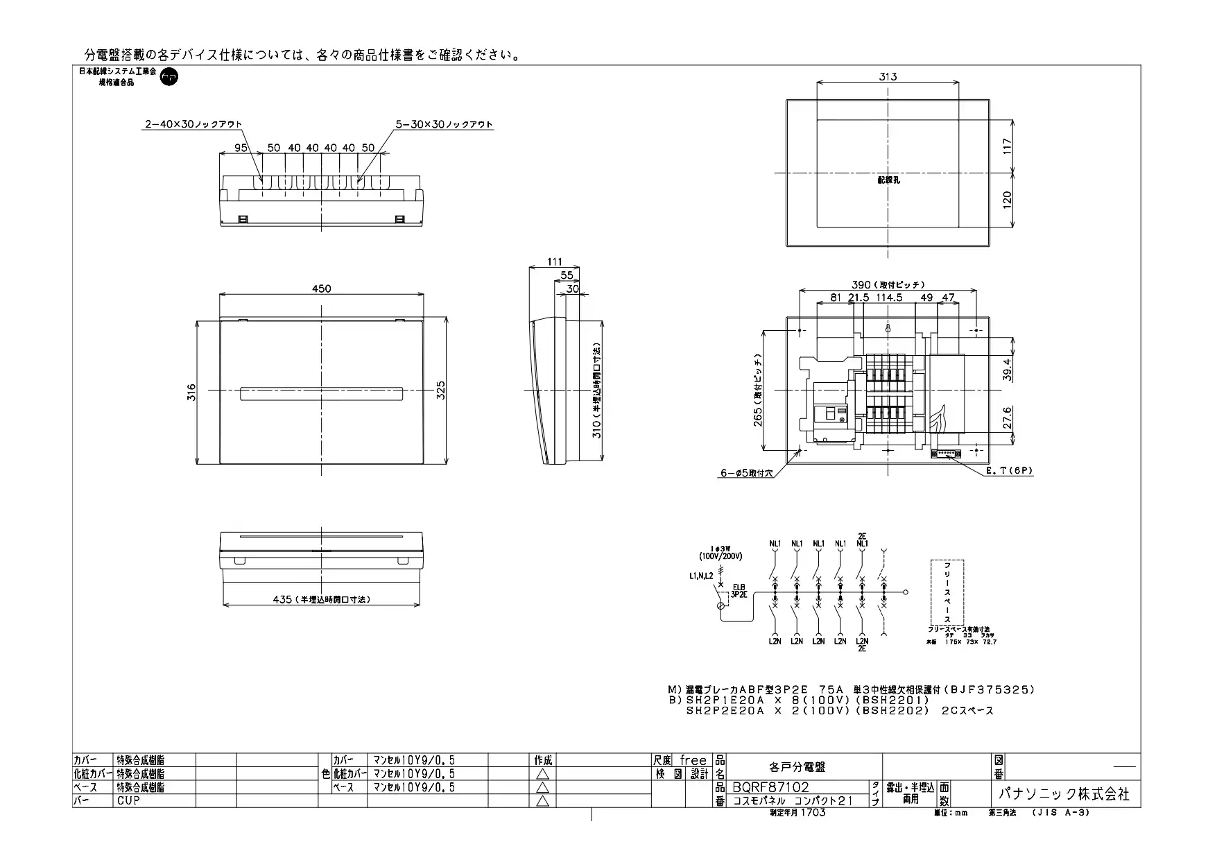 BQRF87102 フタ付・フリースペース付分電盤 単3 リミッタースペースなし 主幹ELB75A 回路数10 + 2