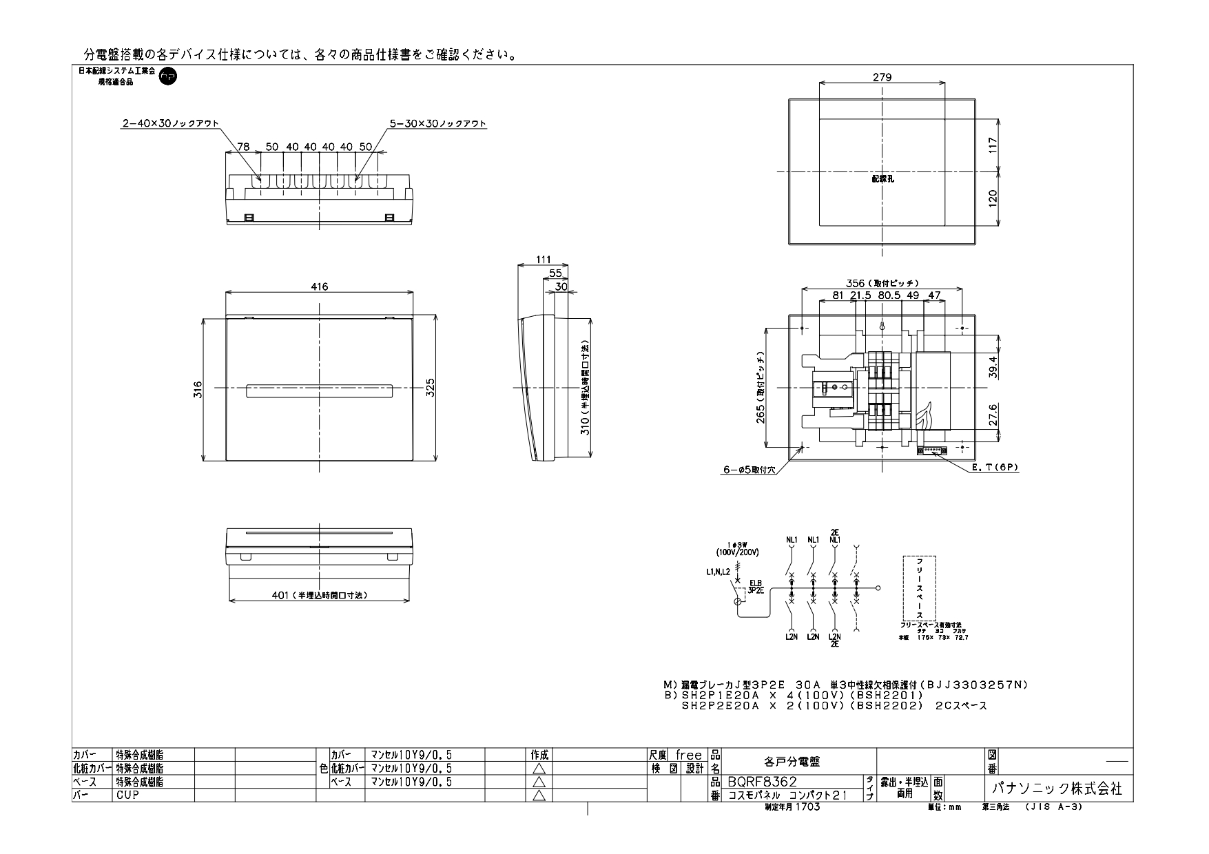 BQRF8362 フタ付・フリースペース付分電盤 単3 リミッタースペースなし 主幹ELB30A 回路数6 + 2