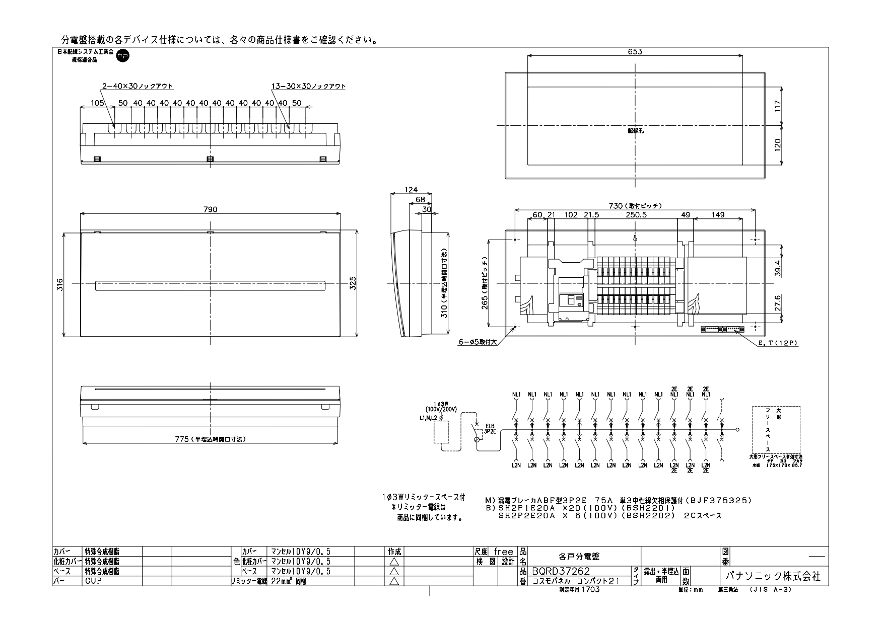 BQRD37262 フタ付・大形フリースペース付分電盤 単3 リミッタースペースあり 主幹ELB75A 回路数26 + 2
