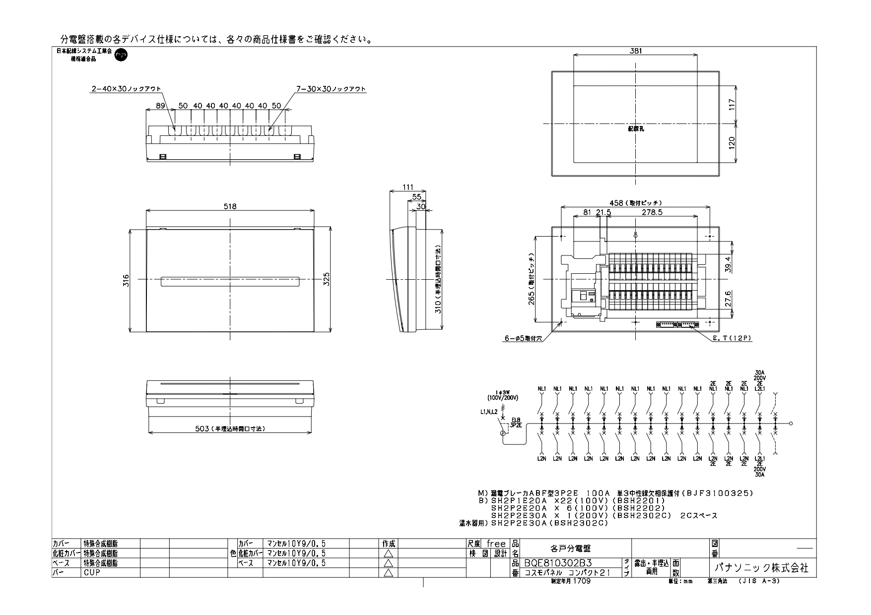 BQE810302B3 エコキュート・電温・IH対応分電盤 単3 リミッタースペースなし 主幹ELB100A 回路数30 + 2(分岐タイプ) エコキュート・電温容量30A
